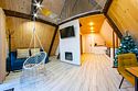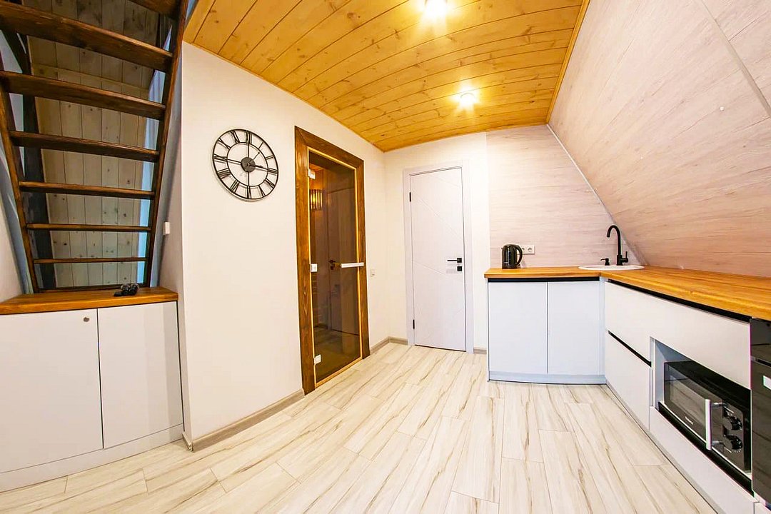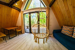 На первом этаже вас ждут финская сауна, полностью оборудованная кухня и уютная обеденная зона. Второй этаж предлагает комфортную двуспальную кровать и дополнительное спальное место на подвесной кровати.