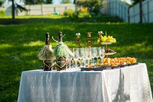 - набор посуды на 15 человек (глубокие тарелки, плоские тарелки, кружки для чая, бокалы под сок, рюмки, фужеры, ложки, вилки и ножи);