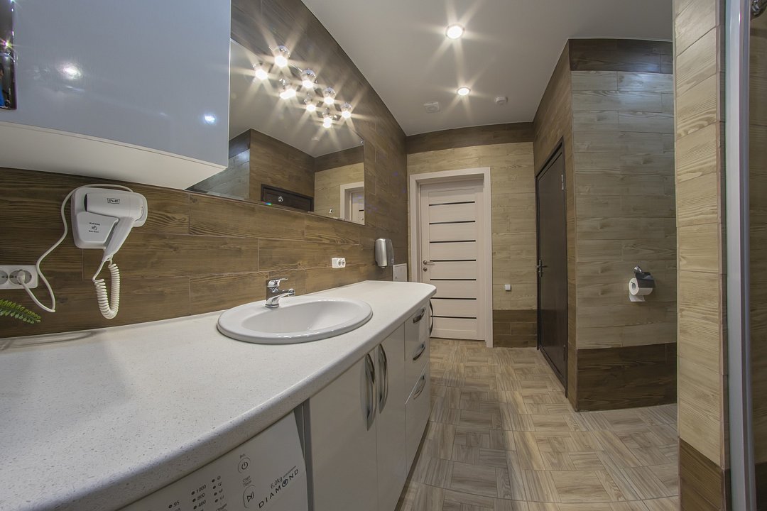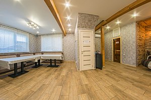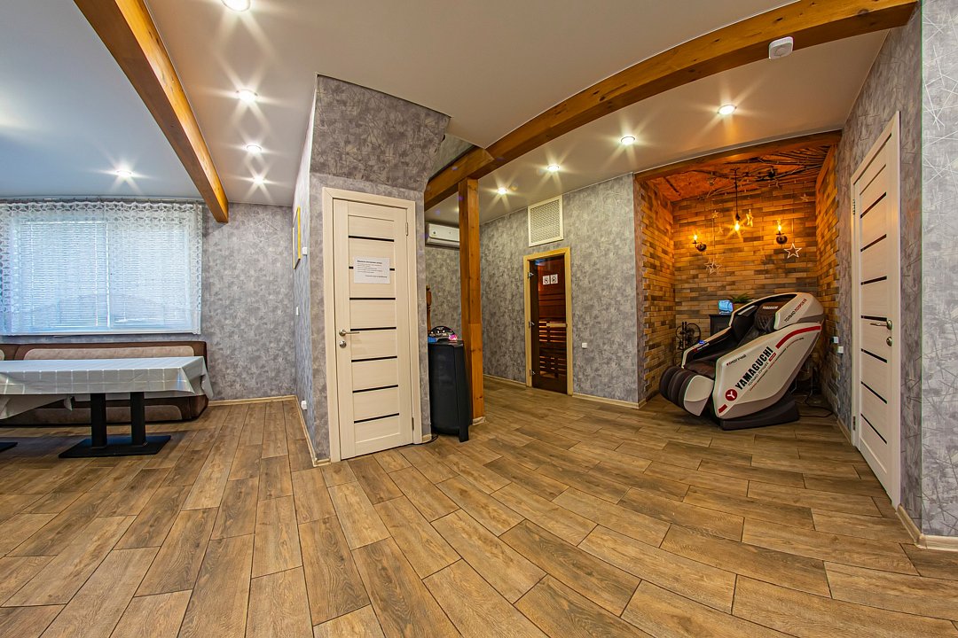 В просторном коттедже вас ждёт сауна, полностью оборудованная кухня, уютная гостиная с камином и массажным креслом, большая столовая, а также караоке, мощная стереосистема и светомузыка для зажигательных вечеринок.