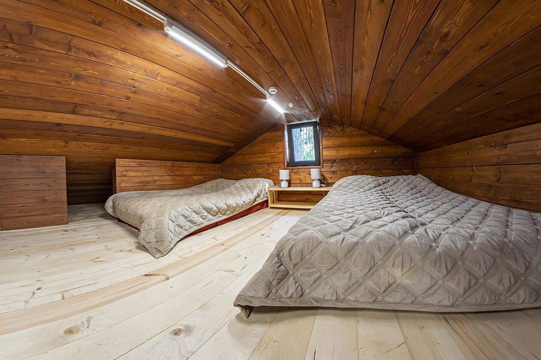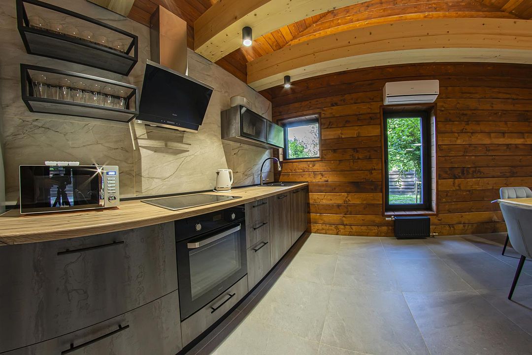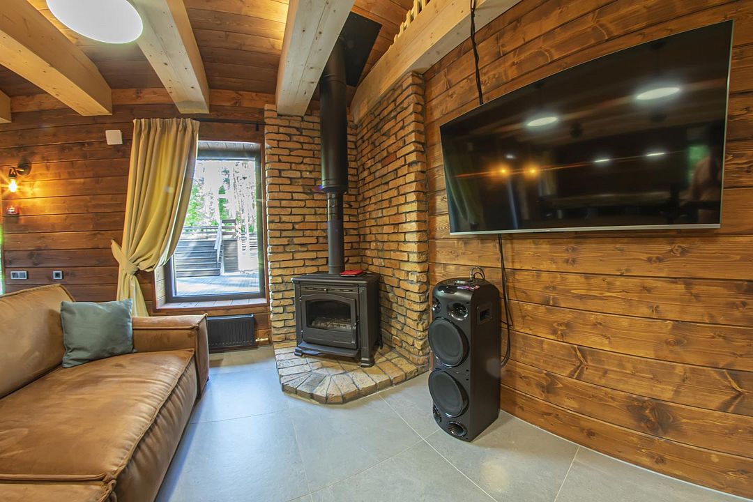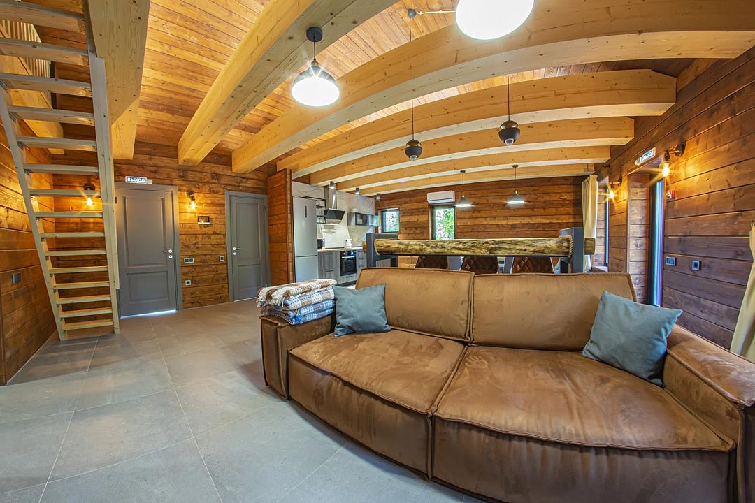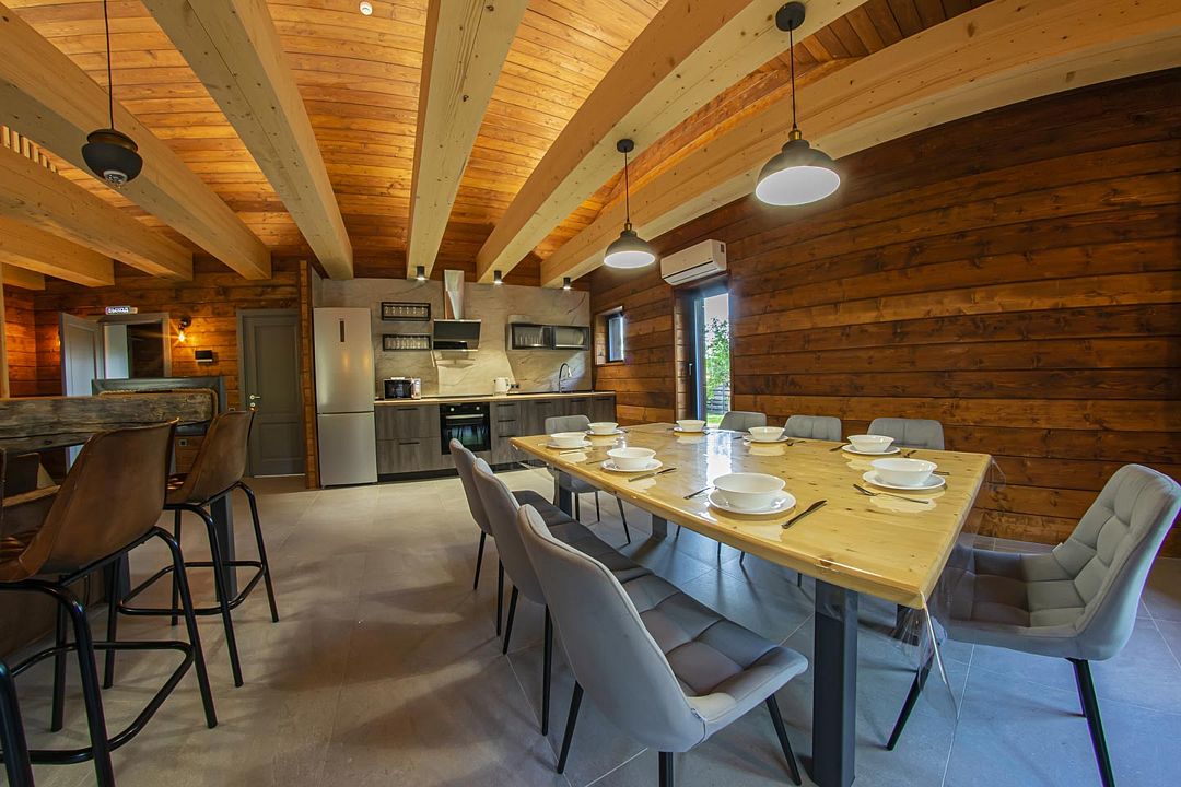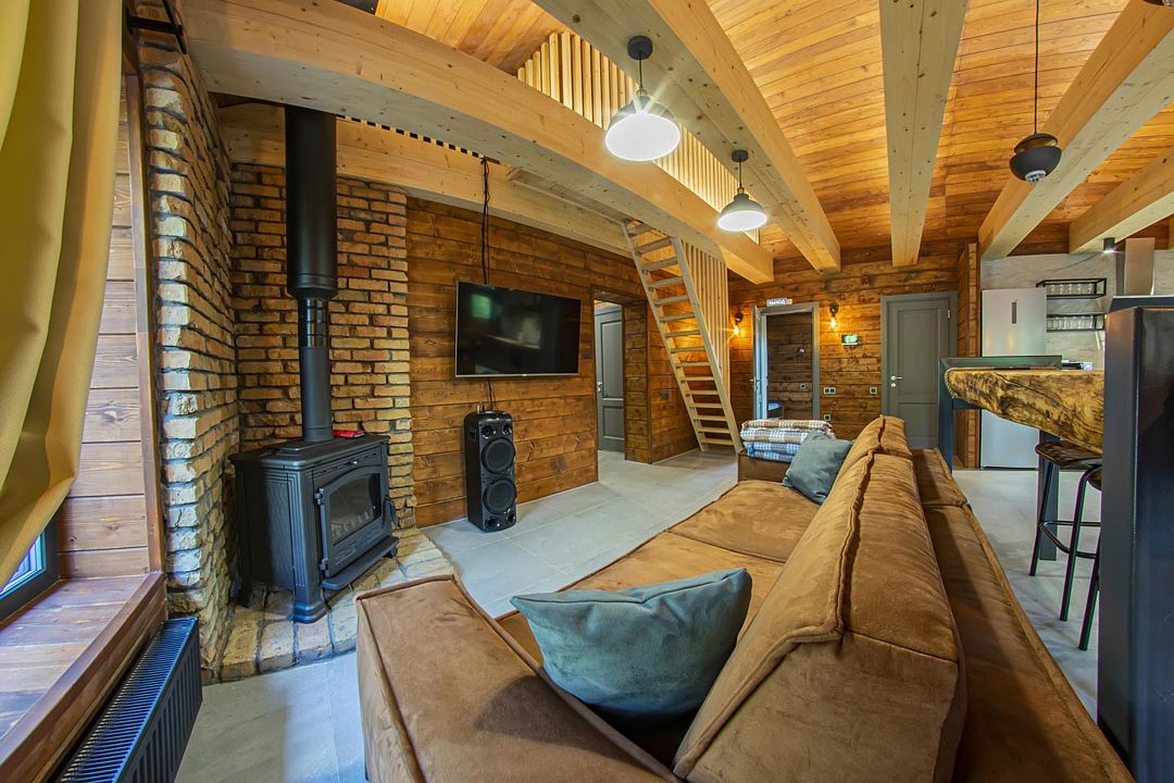 В домике есть 2 обеденных зоны, камин и полностью оборудованная кухня. На втором этаже расположена уютная спальная зона с двуспальными кроватями.