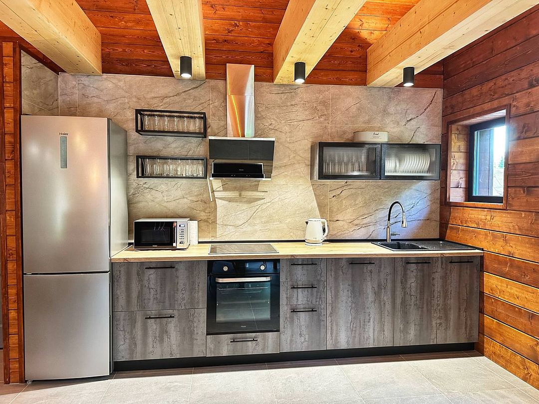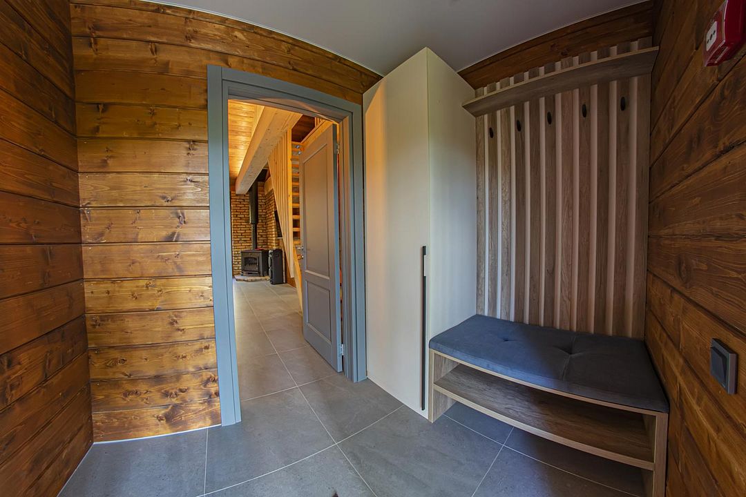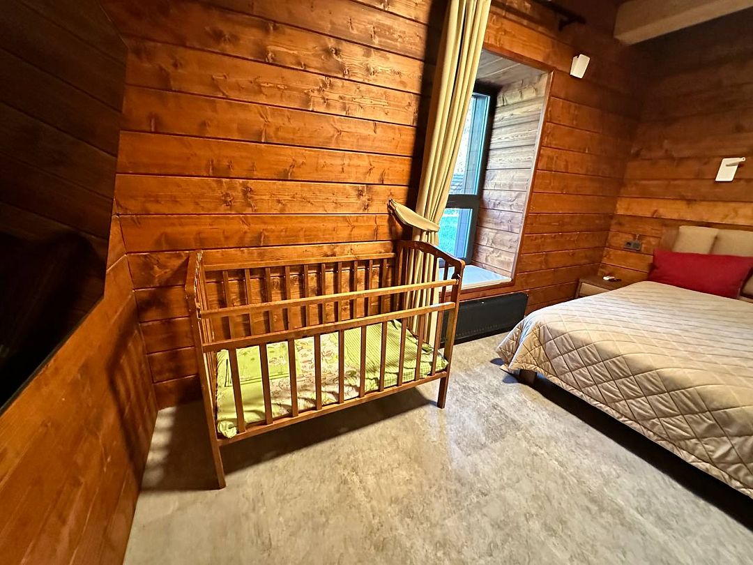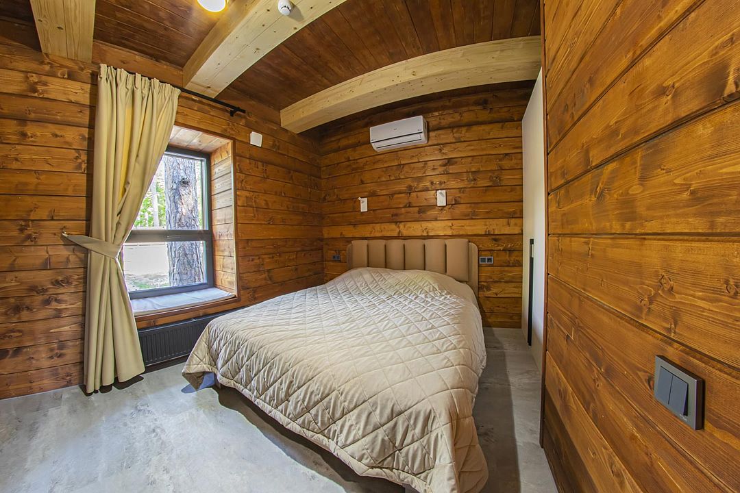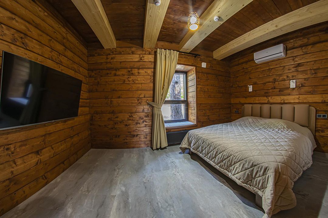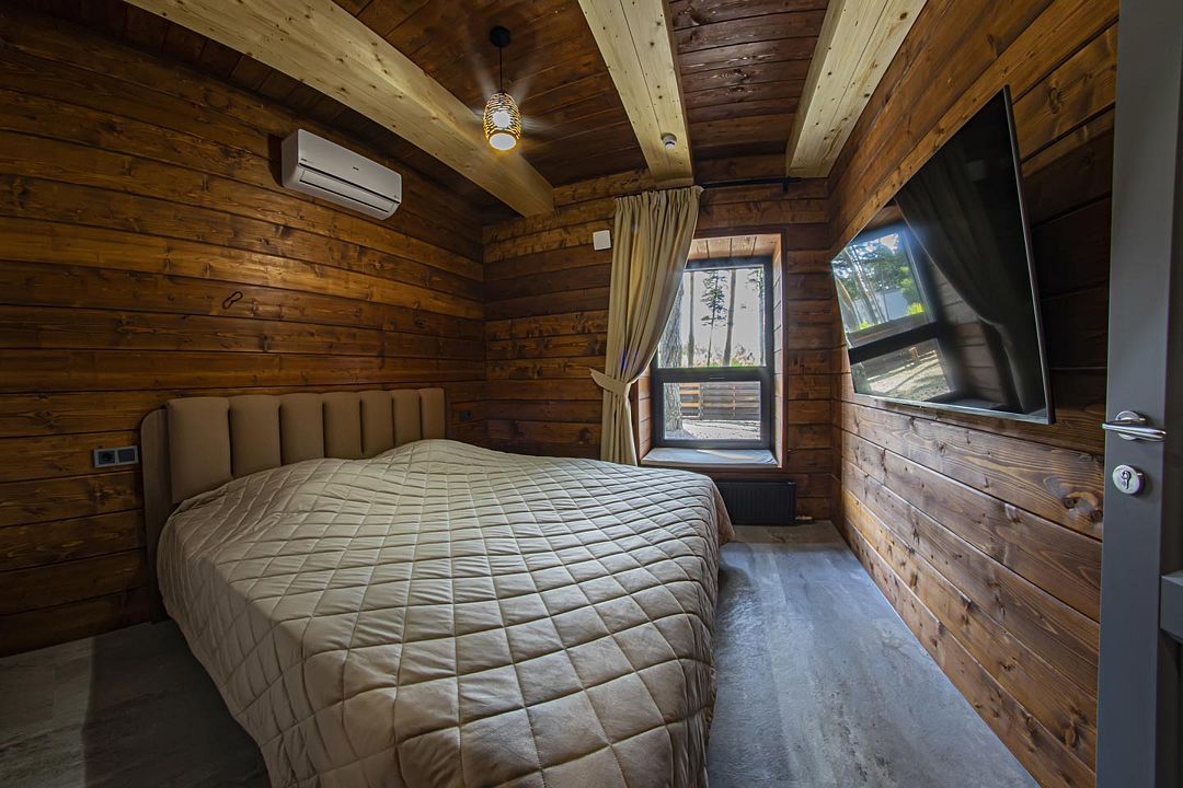 В домике есть 2 обеденных зоны, камин и полностью оборудованная кухня. На втором этаже расположена уютная спальная зона с двуспальными кроватями.