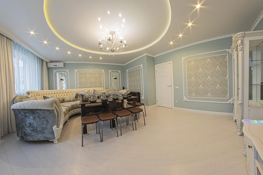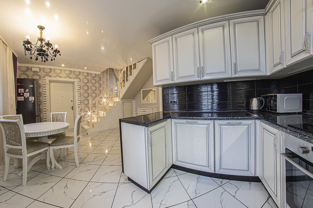 Вы сможете воспользоваться массажным креслом, двумя санузлами (один с душевой кабиной, другой с золотой ванной), феном, теплым полом и стиральной машиной.