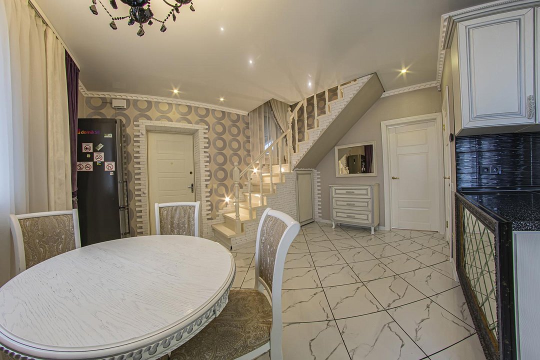 Двухэтажный светлый и просторный домик для отдыха в черте города с большой гостиной. На первом этаже есть большая гостиная с огромным диваном, стереосистемой и мультимедиа, а также кухня и санузел. На втором этаже две спальные комнаты и дизайнерский джакузи.