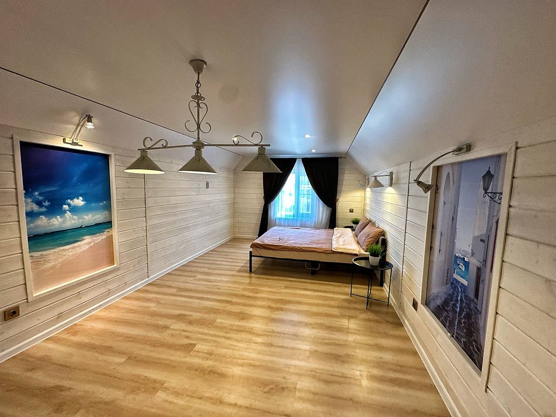 В доме предусмотрено шесть спальных мест: две отдельные комнаты на втором этаже с двуспальными кроватями, двуспальная кровать в гостевом домике и детская кроватка.