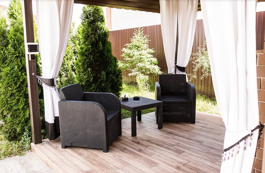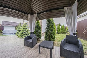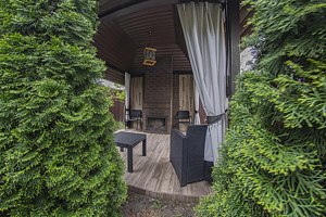 Рядом с банным комплексом расположена уютная летняя беседка с крышей — замечательное место, где можно наслаждаться свежим воздухом в любую погоду. В беседке с комфортом могут разместиться до восьми человек, чтобы провести время в приятной компании, наслаждаясь общением и отдыхом на природе.