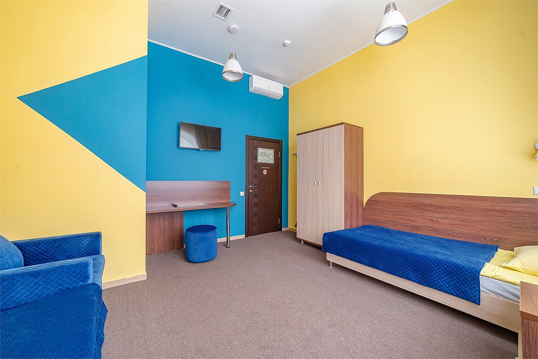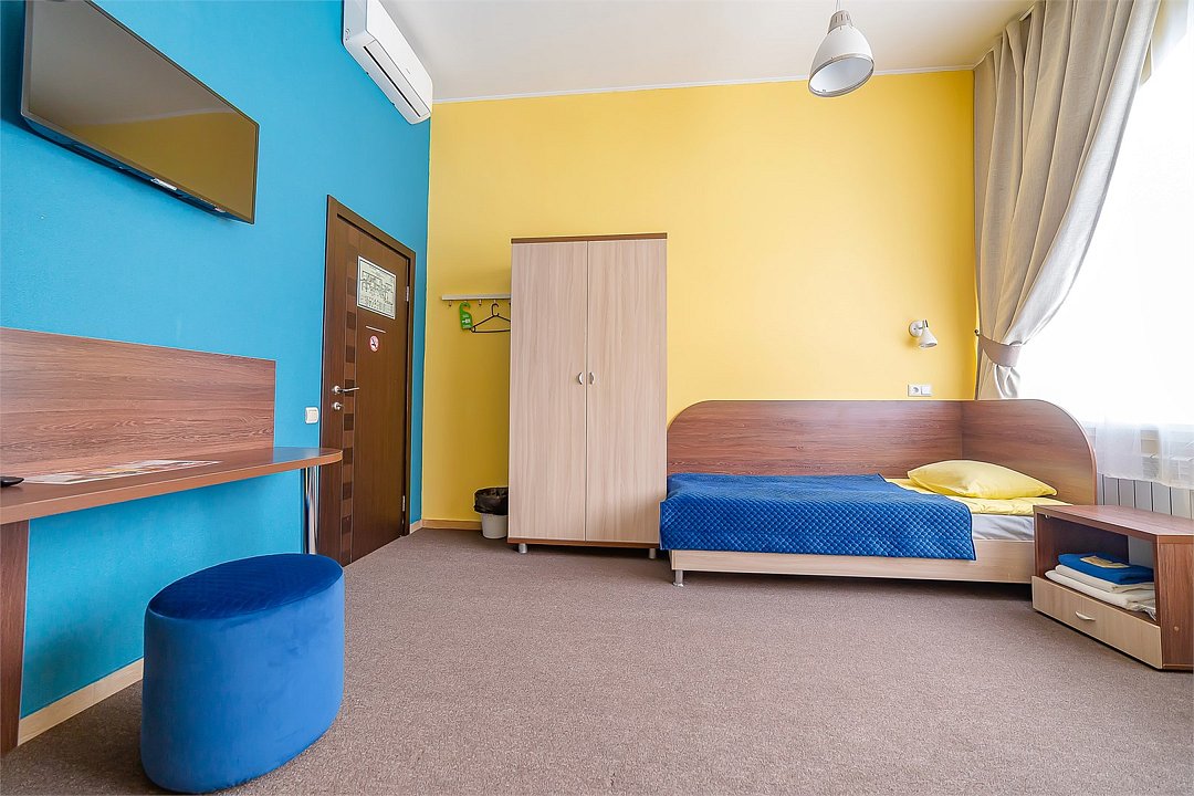 Современное трехэтажное здание отеля находится на пересечении улиц Володарского и Кураева. Жилой фонд рассчитан на единовременное размещение 66 человек. Гости могут выбрать место в общем номере или поселиться в номерах категории Стандарт. Улучшенный, Семейный. Во всех комнатах стильный интерьер и хорошая меблировка, в общих номерах установлены двухъярусные кровати, есть шкафчики с замком для каждого гостя. Улучшенные номера оснащены необходимой бытовой техникой — кондиционером, телевизором, электрочайником, холодильником.