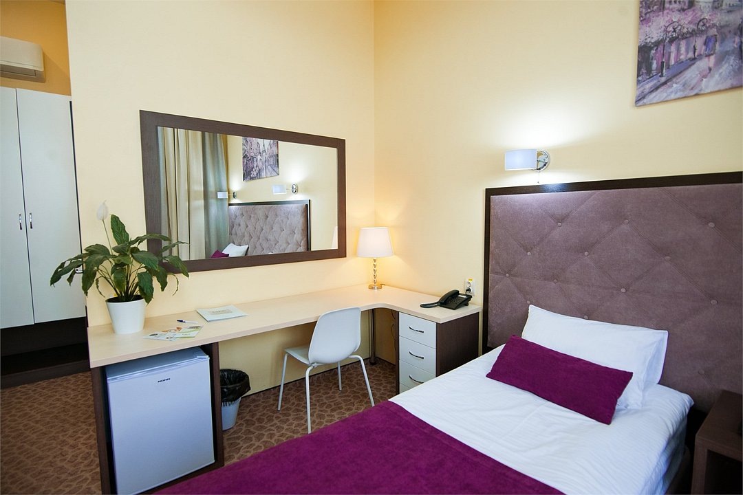 Стильный и комфортный одноместный/двухместный номер с двуспальной или двумя односпальными кроватями на выбор. Площадь номера: 13-16 кв.м. Площадь санузла: 3 кв.м.Услуги и удобства