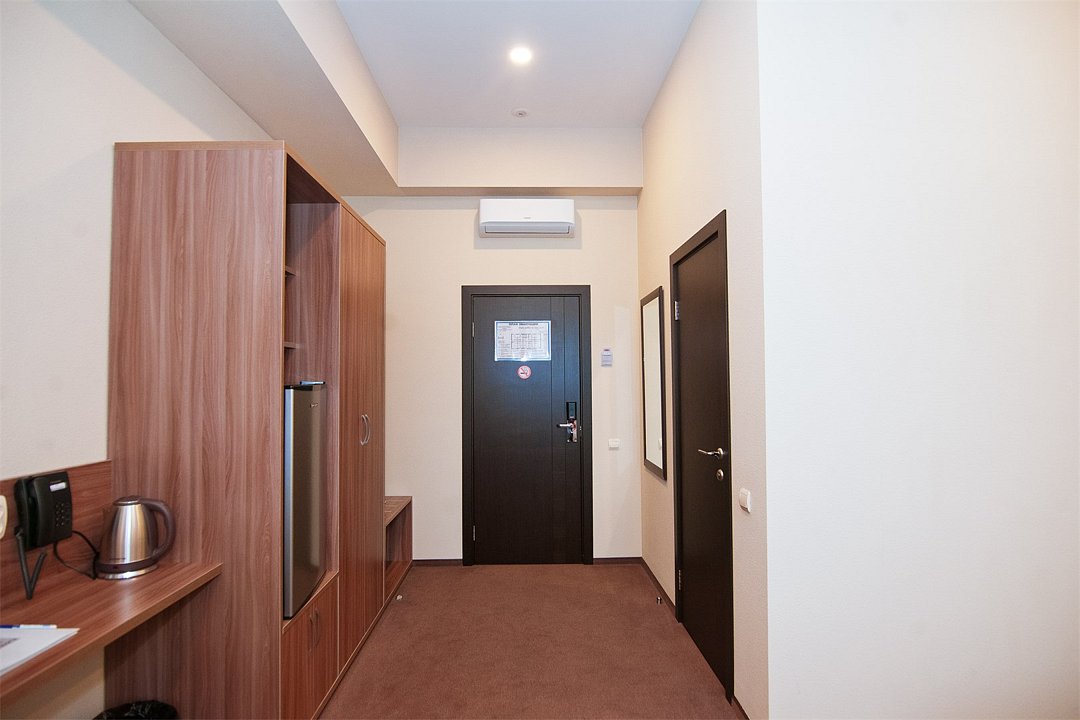 кабельное телевидение, Wi-Fi, телефон, холодильник, кондиционер, светильник, фен, система безопасности, электронные замки, утюг, банные полотенца, тапочки, гигиенические средства, две односпальные или большая двуспальная кровать, гладильная доска, кресла, шкаф для одежды, вешалки, журнальный столик, багажная тумба, зеркало, письменные принадлежности, информационная карта, меню, сейф, ковровое покрытие, отопление, душ, кулер на этаже, вид во двор, высокие потолки, стаканы, тумба, туалетные средства, туалет, телевизор с плоским экраномВ гостиничном номере