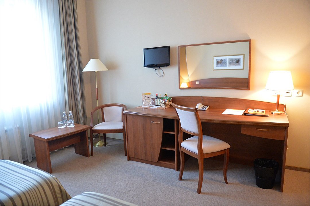 Приятная цветовая гамма, эргономичная мебель и просторное рабочее место - ключевые пункты при выборе номера для командировок. Стандарт с двумя кроватями отлично подойдет для деловых гостей города, предоставляя отличное место для работы и отдыха! Интерьер номера включает как традиционные, так и современные элементы. В удобной ванной комнате все необходимые косметические принадлежности и комплект полотенец.Услуги и удобства