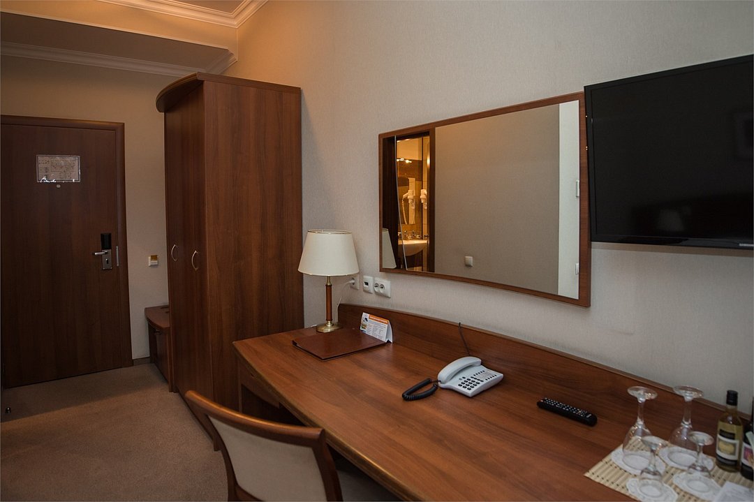 Приятная цветовая гамма, эргономичная мебель и просторное рабочее место - ключевые пункты при выборе номера для командировок. Стандарт с одной двуспальной кроватью отлично подойдет для деловых гостей города, предоставляя отличное место для работы и отдыха! Интерьер номера включает как традиционные, так и современные элементы. В удобной ванной комнате все необходимые косметические принадлежности и комплект полотенец.Услуги и удобства