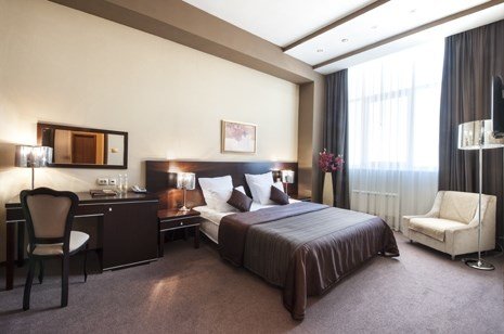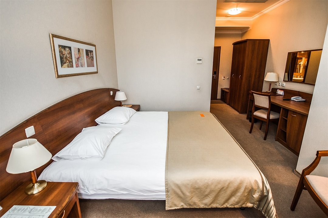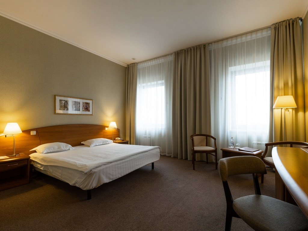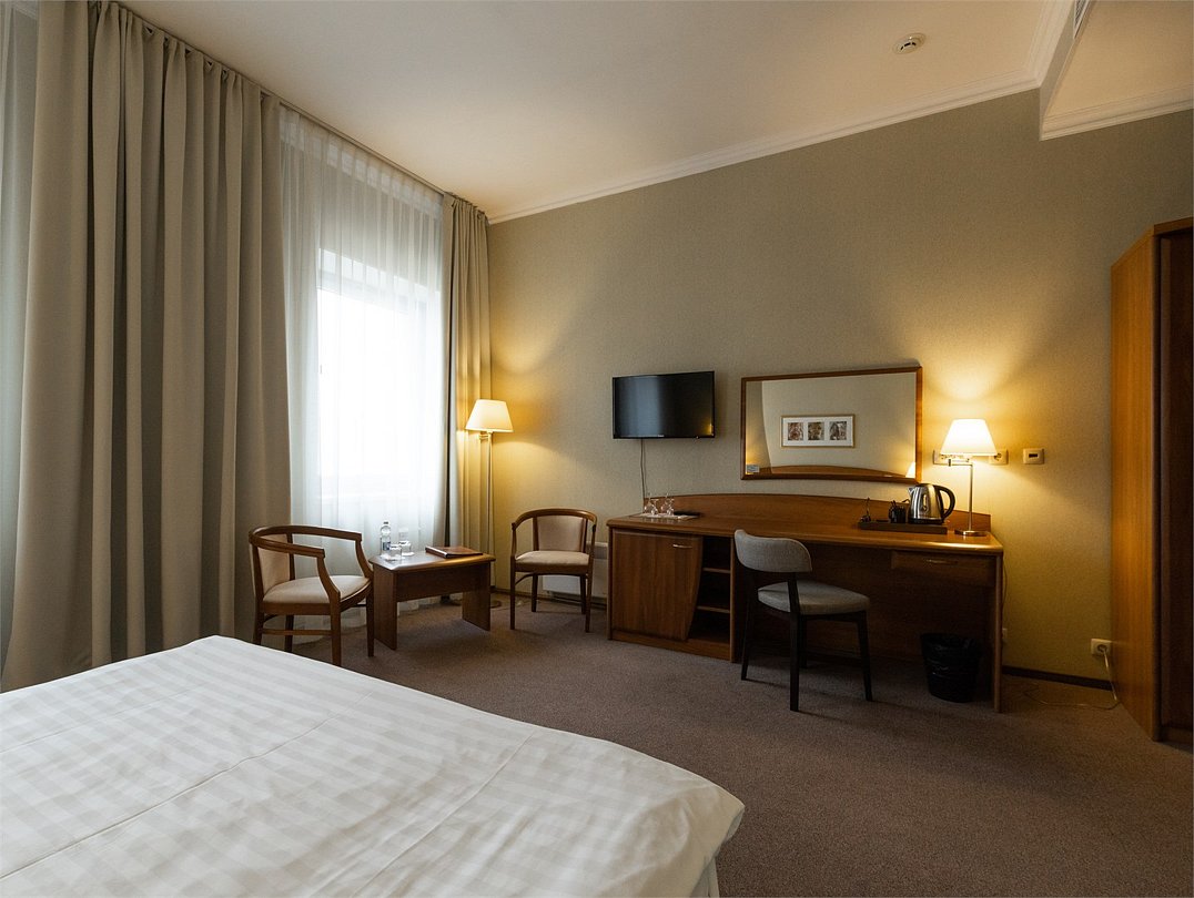Приятная цветовая гамма, эргономичная мебель и просторное рабочее место - ключевые пункты при выборе номера для командировок. Стандарт с одной двуспальной кроватью отлично подойдет для деловых гостей города, предоставляя отличное место для работы и отдыха! Интерьер номера включает как традиционные, так и современные элементы. В удобной ванной комнате все необходимые косметические принадлежности и комплект полотенец.Услуги и удобства