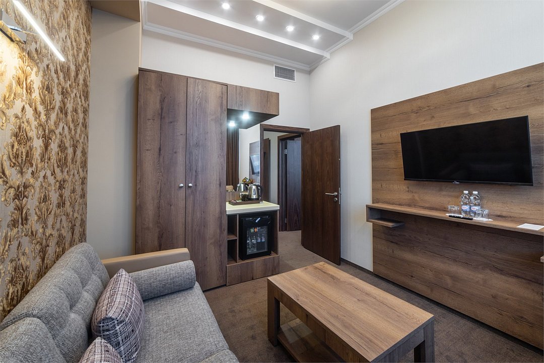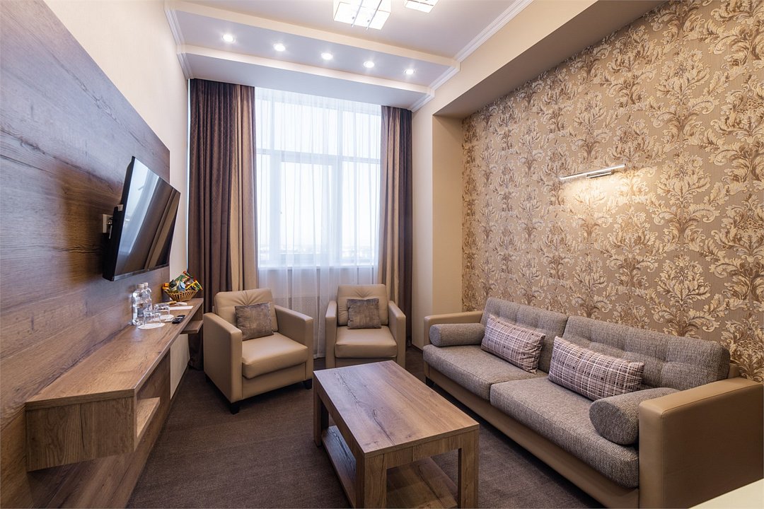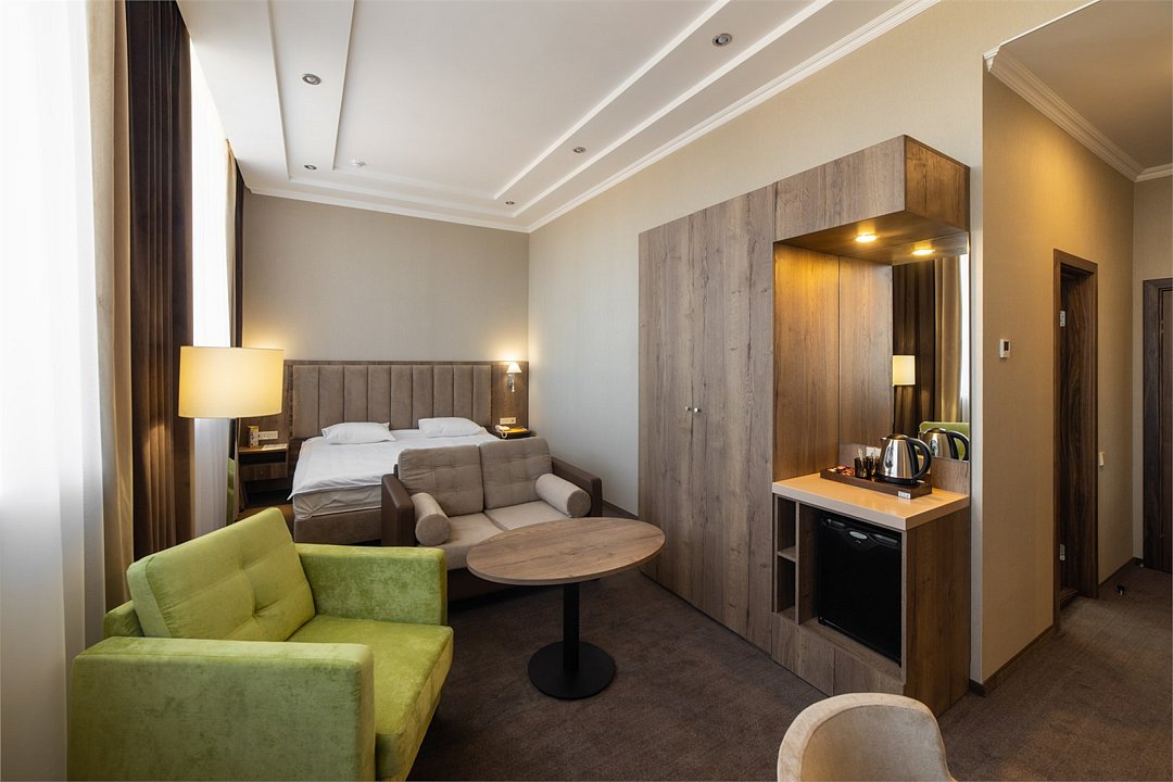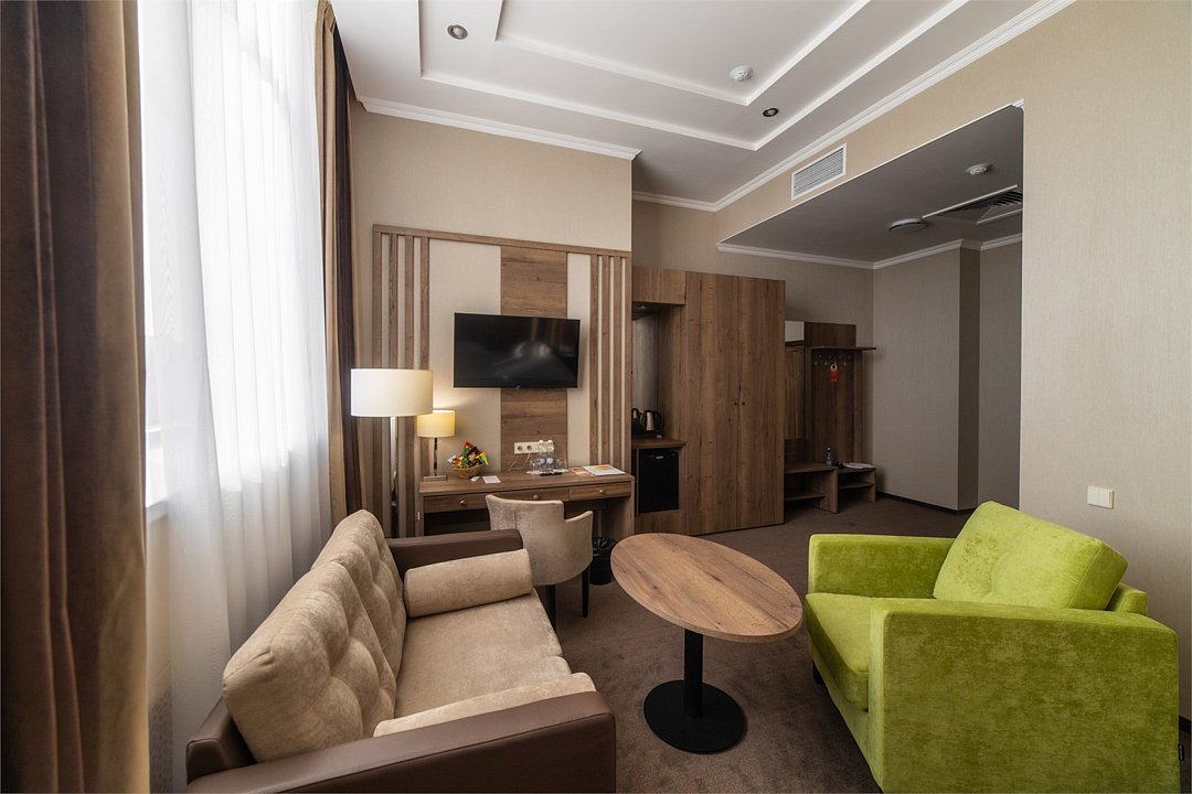 Джуниор Сюит Премиум - это идеальный выбор для тех, кто ценит комфорт, стиль и уют. Современный дизайн интерьера, высокий уровень комфорта и учтенные при создании номеров пожелания наших гостей сделают Ваше пребывание незабываемым. Номер прекрасно подходит для проживания семей с детьми, молодоженов и деловых туристов. А с восьмого этажа, где расположены номера, открывается потрясающий вид на город, который позволит Вам насладиться отдыхом или работой.Услуги и удобства