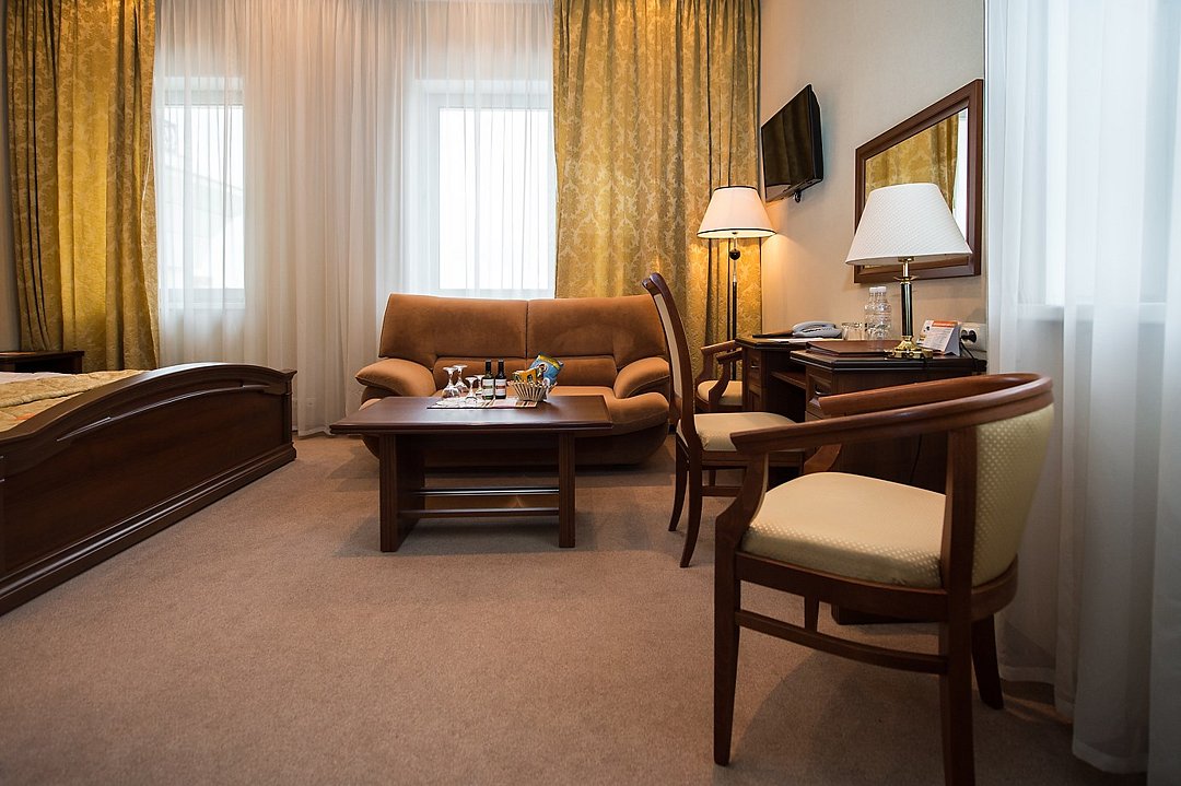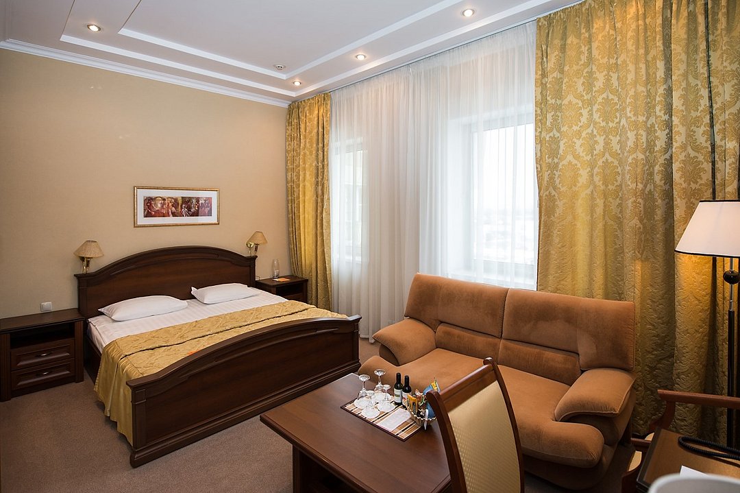 Просторные двухкомнатные номера категории Люкс – идеальный вариант для гостей, ценящих настоящий комфорт. Яркие цвета, эргономичная мебель и тщательно продуманная планировка - то, что нужно, чтобы привести силы и дух в порядок. Люксы расположены на VIP-этаже с прекрасным панорамным видом на центр города Пенза. Номера категории Люкс ― это не только красивый интерьер и удобная мебель, но и продуманное техническое и бытовое оснащение. В каждой комнате есть телевизор, Wi-Fi, кондиционер. Ванная оборудована современной сантехникой, а также полным комплектом банных полотенец и косметических принадлежностей. Для всех гостей, проживающих в номере Люкс, предоставляется безлимитное посещение Аквазоны в HELIOSPA (по предварительной записи или при наличии мест).Услуги и удобства