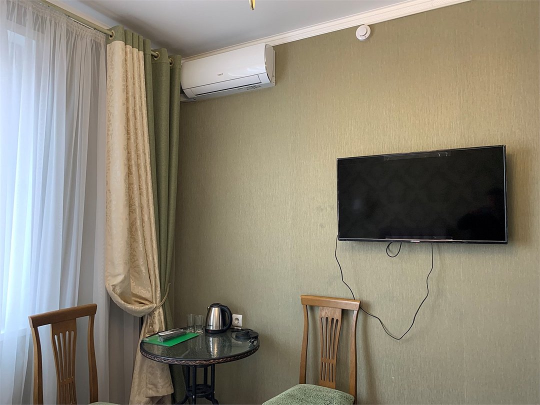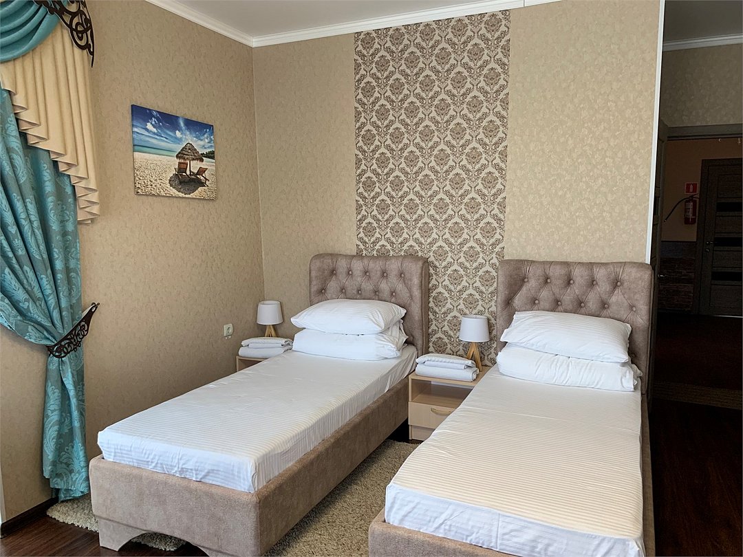Две односпальные кровати,прикроватные тумбочки, светильники,телевизор,кондиционер,круглый стол, два стула душевая кабина, туалет, раковина. Возможно кровати ставить вместеУслуги и удобства