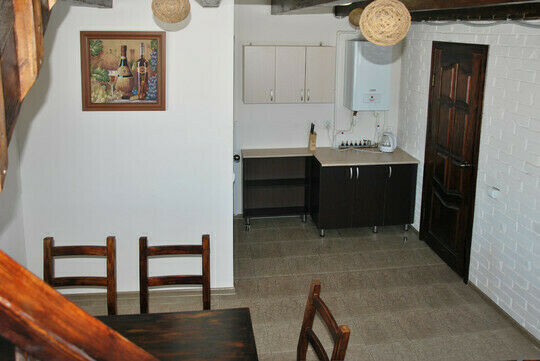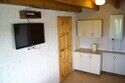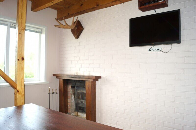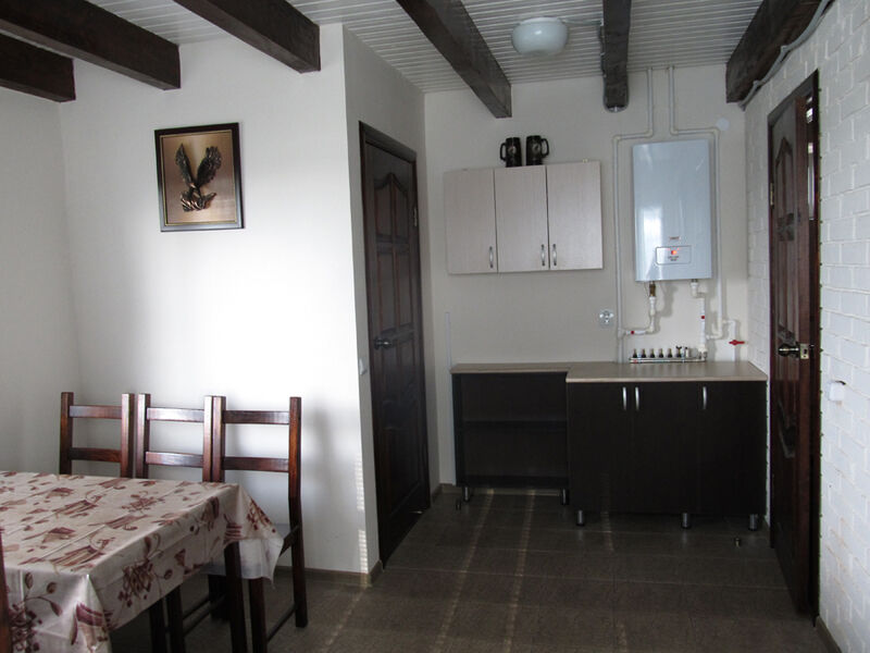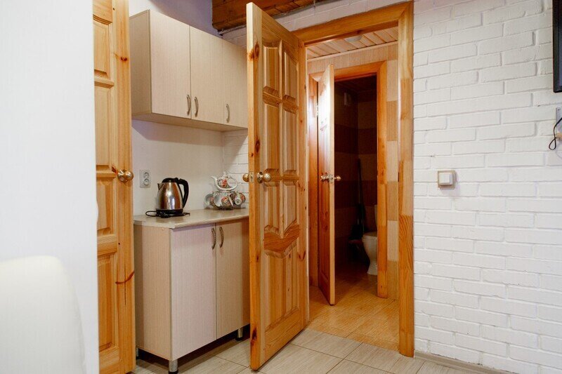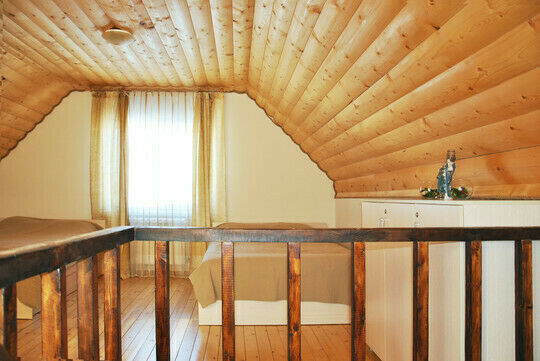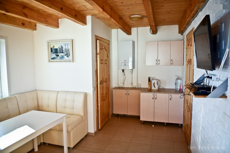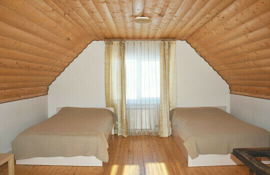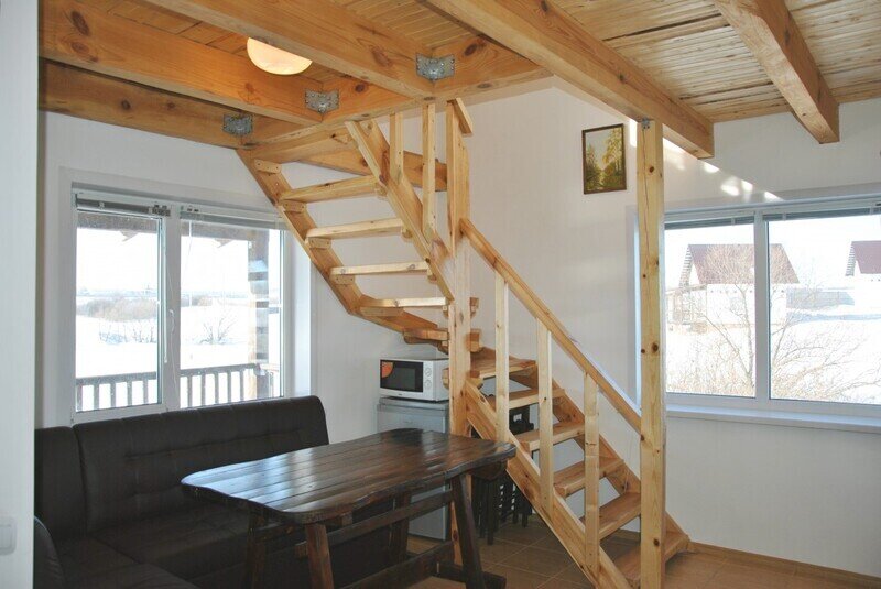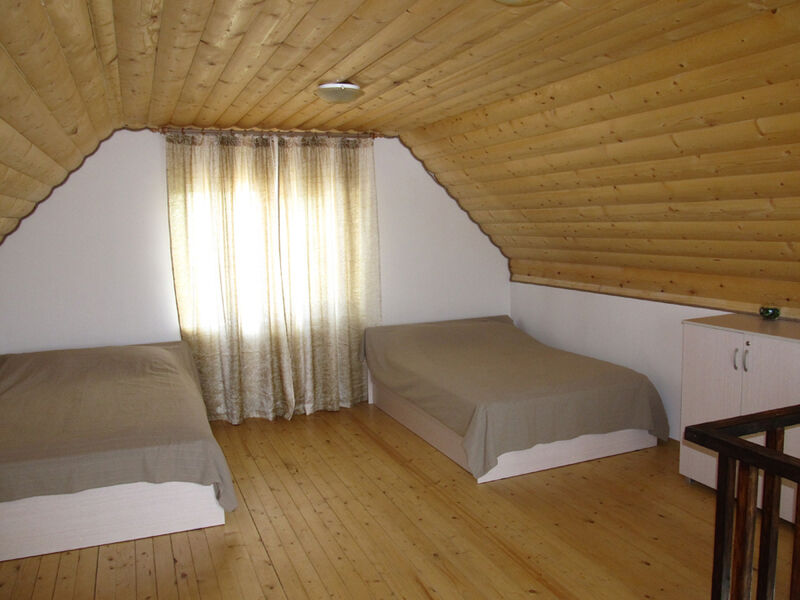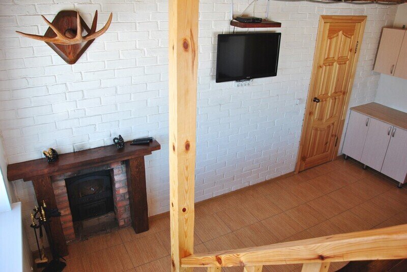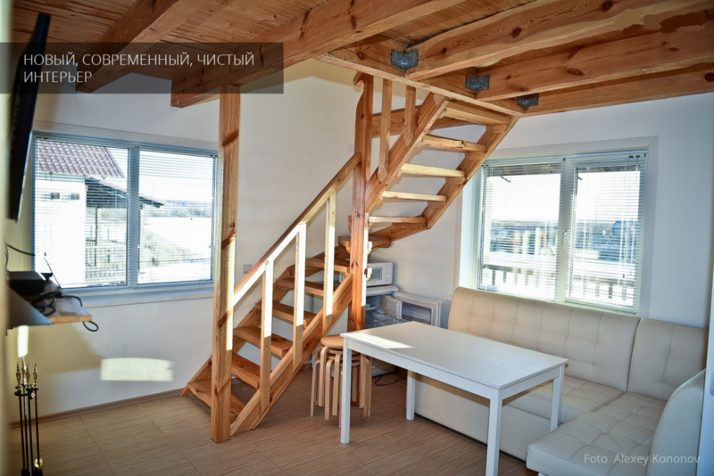 На первом этаже расположена гостиная, веранда, ванная комната, баня на дровах и выход к пруду. Так же стоит отметить наличие мини-кухни со всеми необходимыми столовыми приборами и посудой. На втором этаже находится спальная комната с двумя кроватями и диваном.