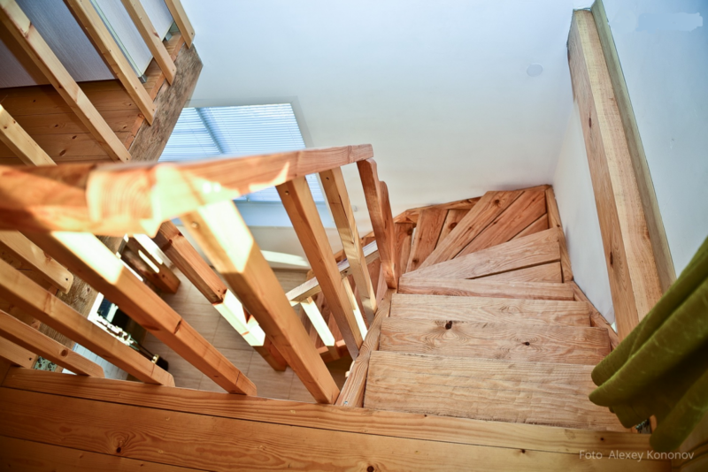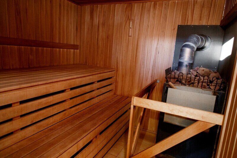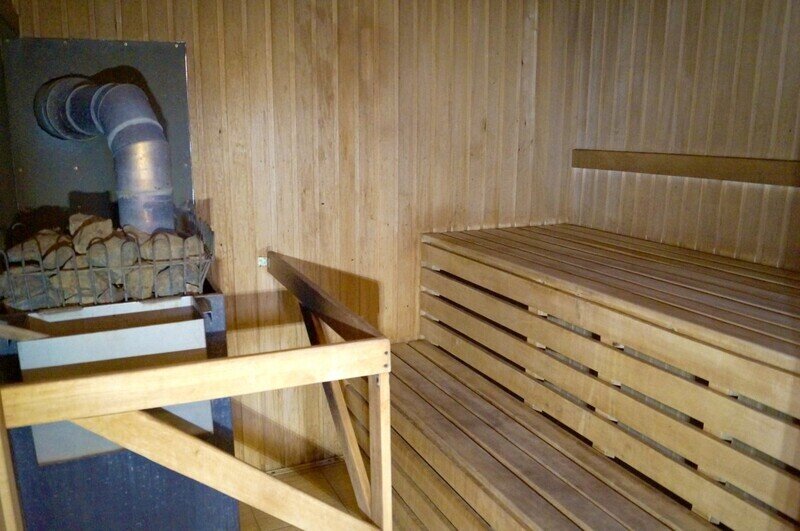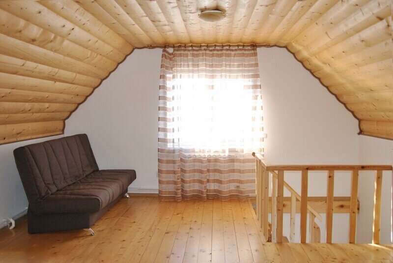 На первом этаже расположена комната отдыха с кожаным диваном (полноценным спальным местом в случае необходимости), русская баня и выход к пруду. На втором этаже — одна большая спальная комната.