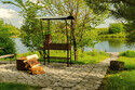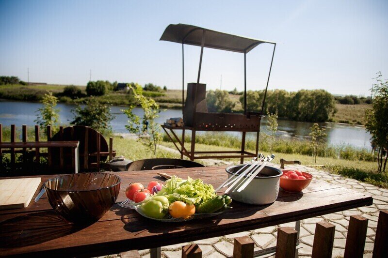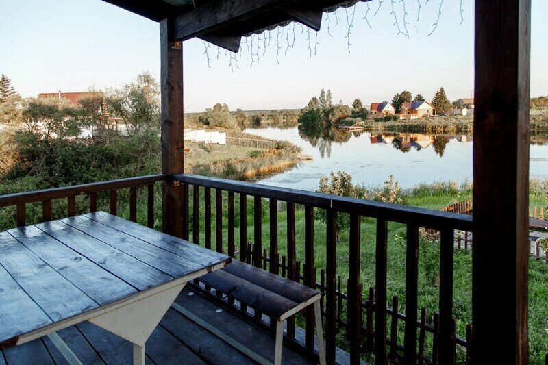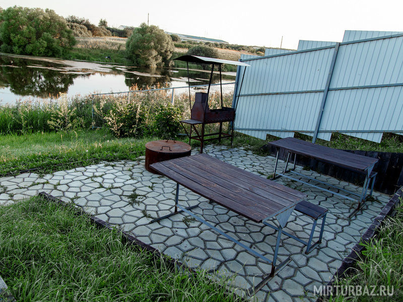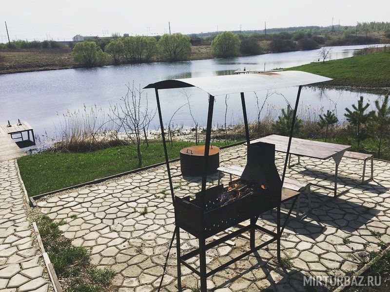 На прилегающей территории расположены лавки и столы, очаг для приготовления еды и место для ловли рыбы и купания.