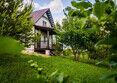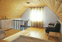 2-этажный коттедж удален от основных зданий и других домов. На первом этаже расположены основные помещения типа гостиной, мини-кухни, ванной комнаты, бани и веранды с выходом в пруд. На втором этаже расположена спальня с двумя кроватями.