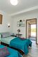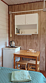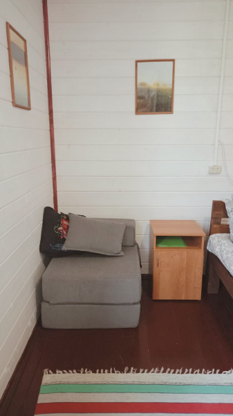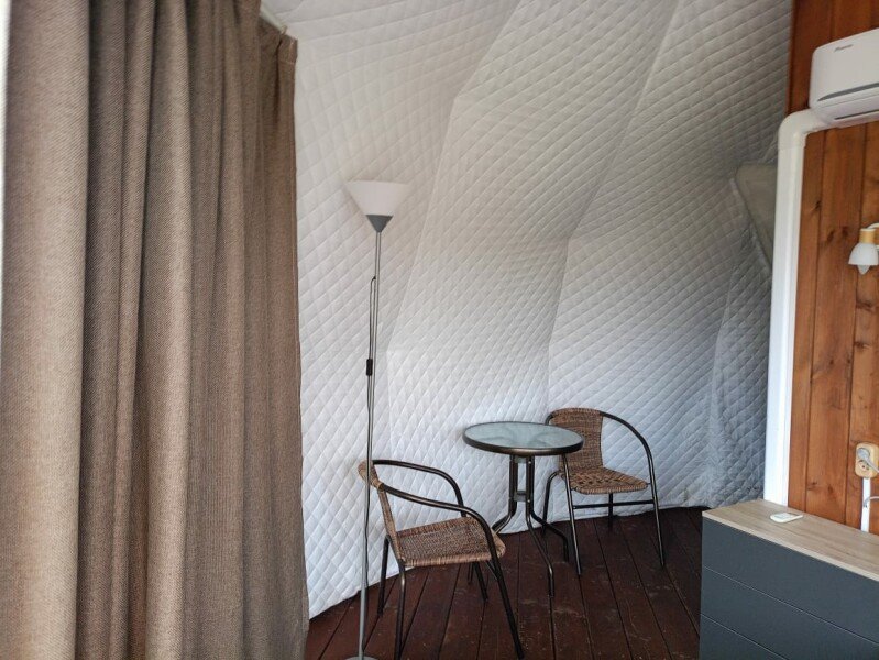Внутри 2 кровати (двухспальная и односпальная), мини-кухня, холодильник, комод. Площадь номера 16 м2, площадь веранды 14 м2.