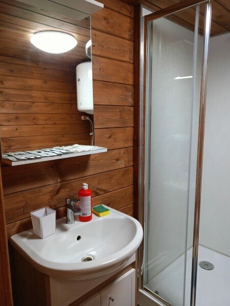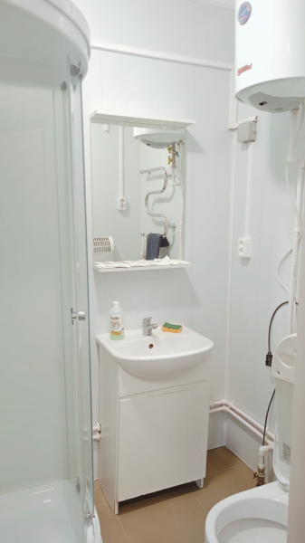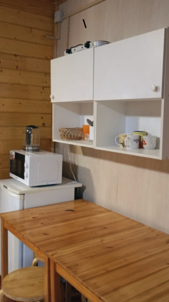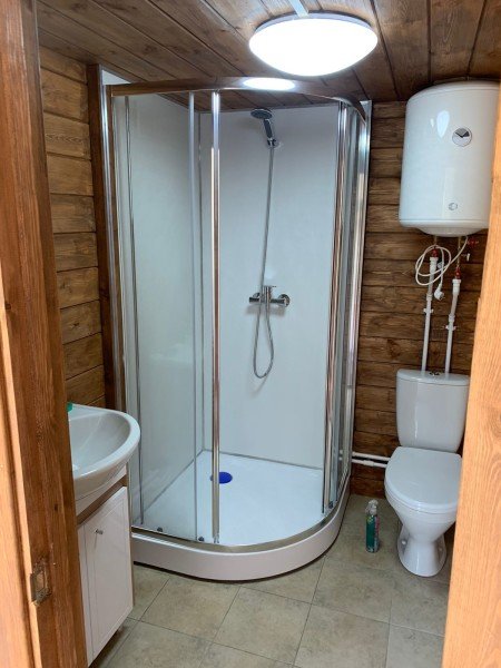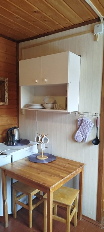 В домике своя кухня, сан-узел с горячей водой в душе, обогреватель.