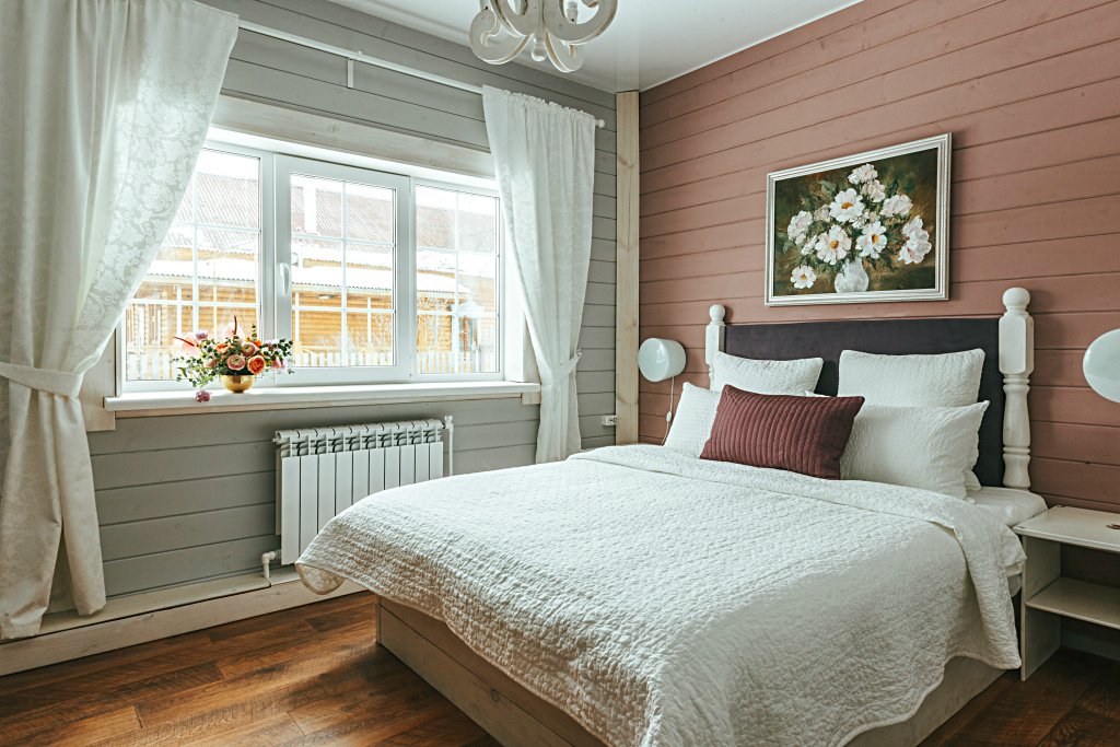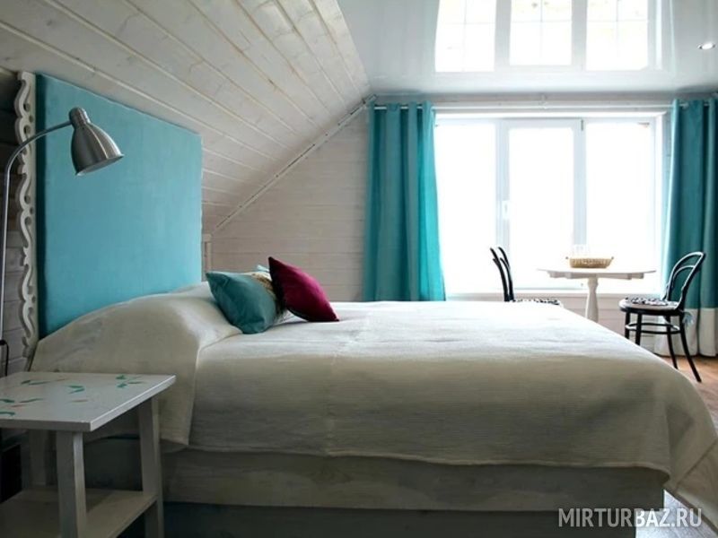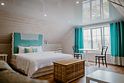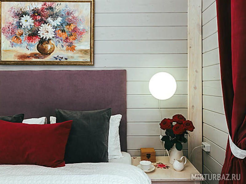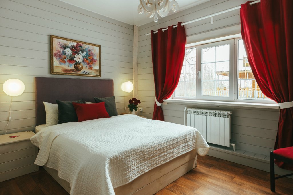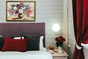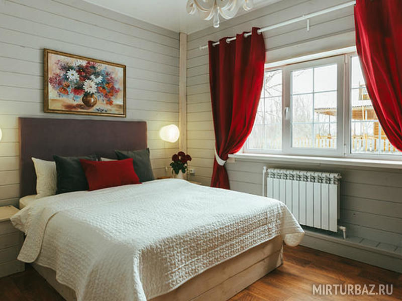 В интерьере номера игра контрастов: белоснежное покрывало и ярко-красные шторы из бархата. Тип кровати: двуспальная кровать Queen size. Ванная комната: душевая кабина и сан. узел совмещенные, комплект косметики для душа, тапочки, фен, комплект полотенец. Уютный номер располагает к спокойному отдыху, большая и удобная кровать с белоснежным бельем сделает Ваш сон комфортным. В свободное время можно разместиться в просторном холле за чашечкой чая, а утром насладиться вкусным домашним завтраком.