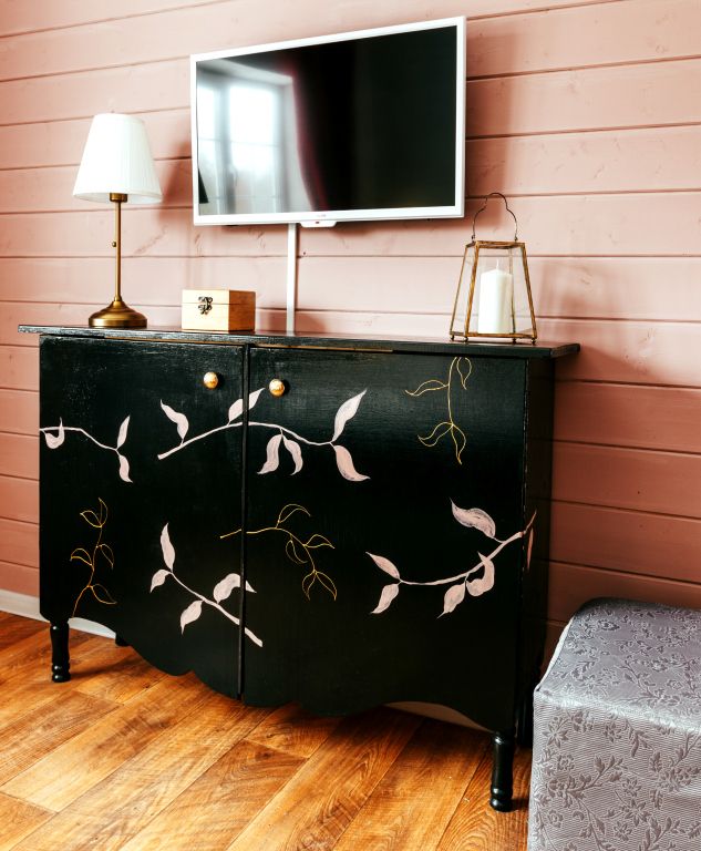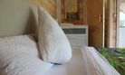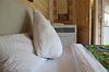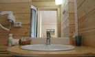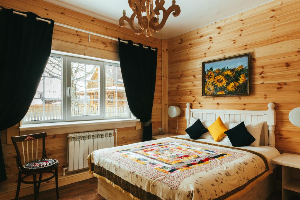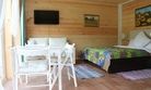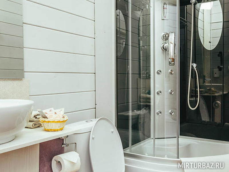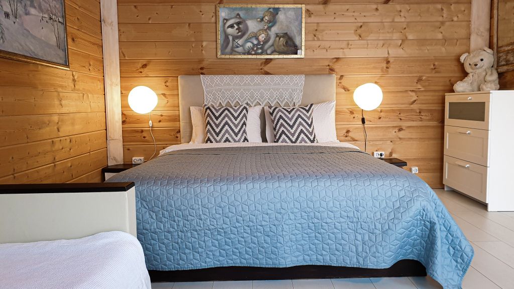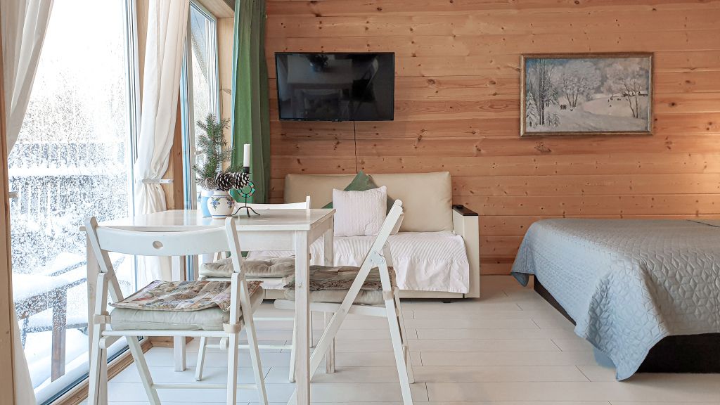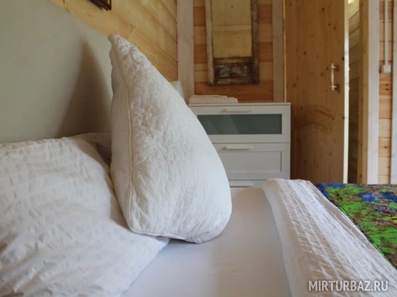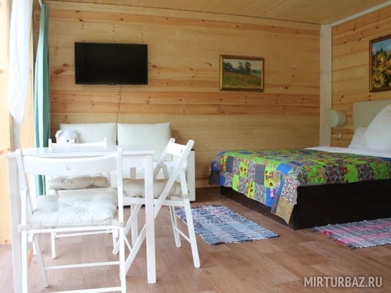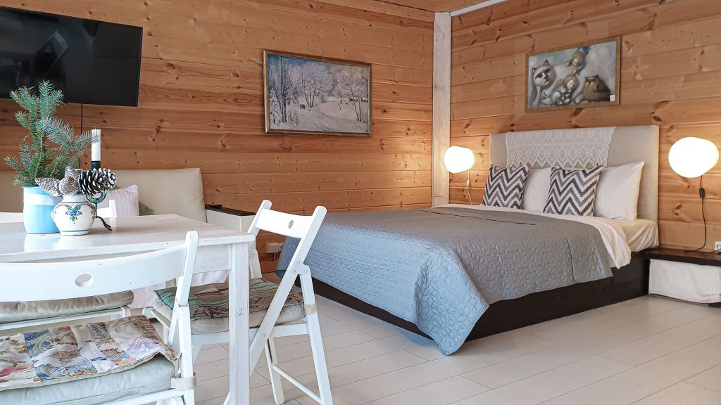 40 кв .м., кровать 180 см, сан узел с душевой кабиной, TV, Wi-Fi, полотенца, косметические принадлежности, тапочки, халаты, подушки с эффектом памяти, ортопедический матрас, холодильник, чайник, столик и стулья, окна на лес, мебель из натурального дерева.