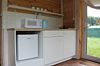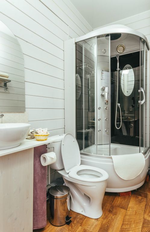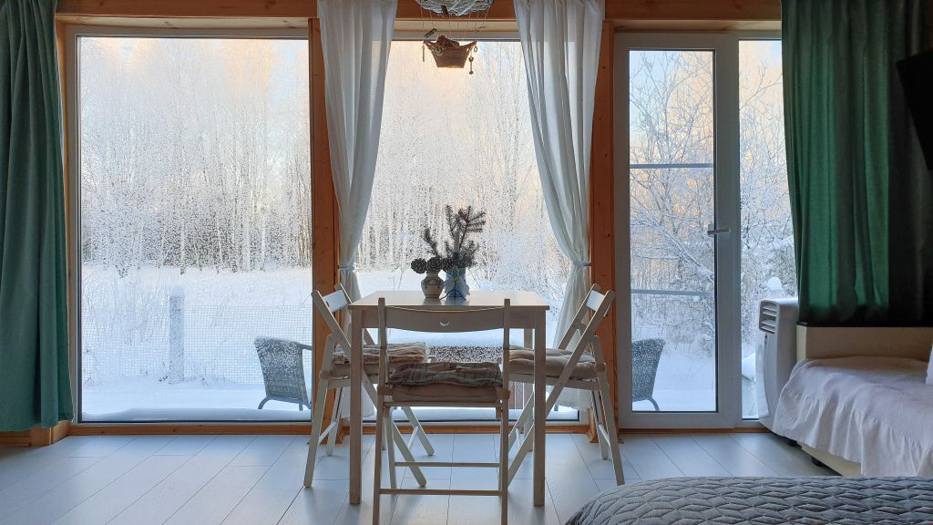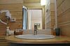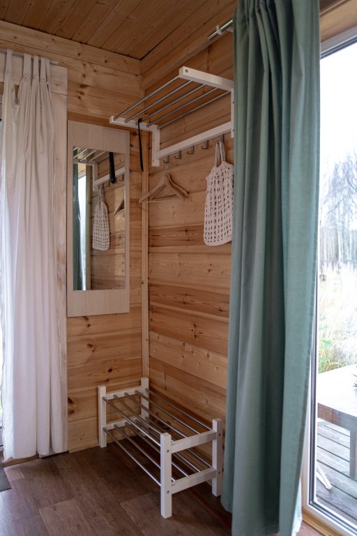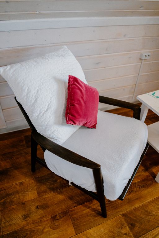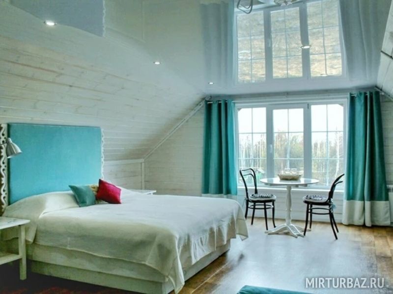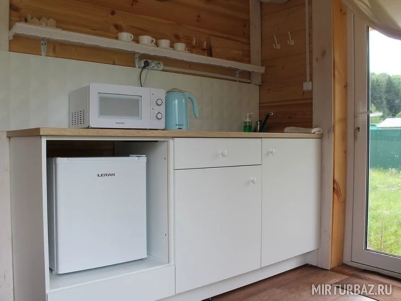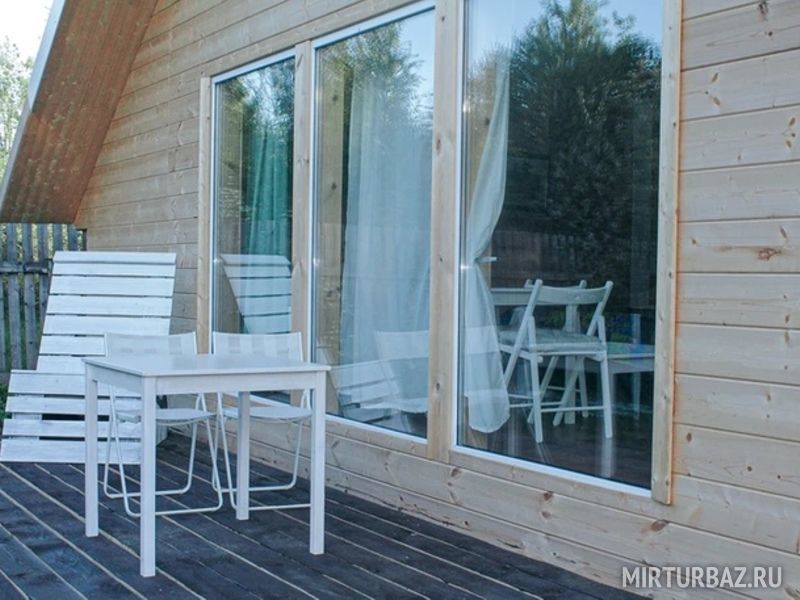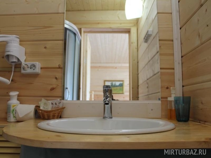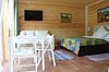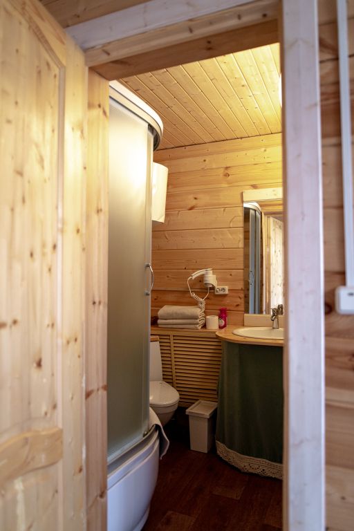 24 кв .м., кровать 160 см, сан узел с душевой кабиной, TV, Wi-Fi, полотенца, косметические принадлежности, тапочки, подушки с эффектом памяти, ортопедический матрас, холодильник, чайник, СВЧ, посуда, столик и стулья, панорамные окна на березовую рощу, мебель из натурального дерева, индивидуальная веранда с садовой мебелью.