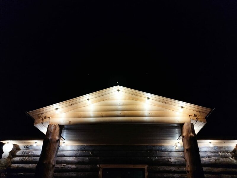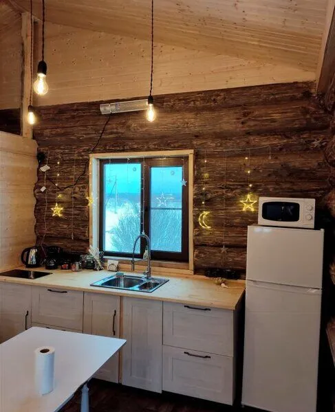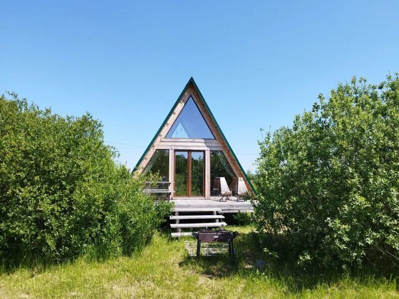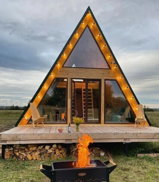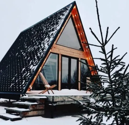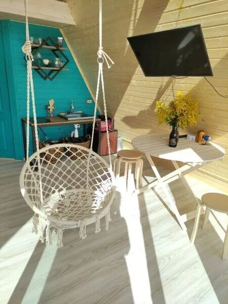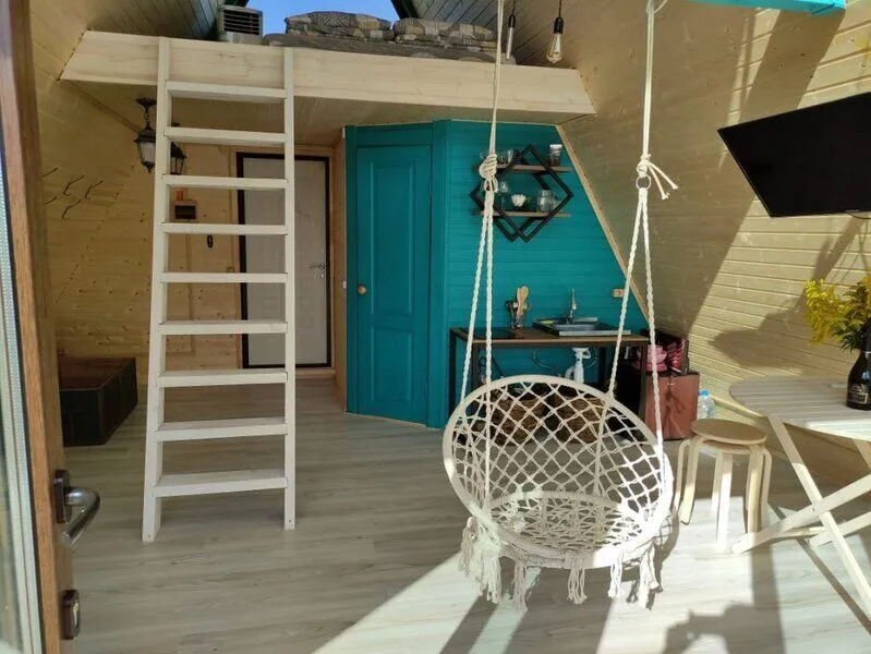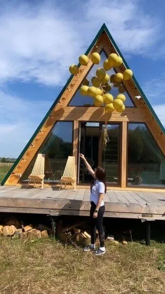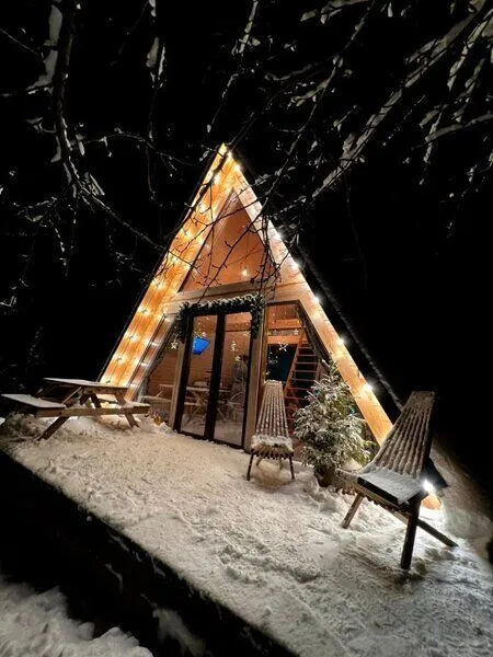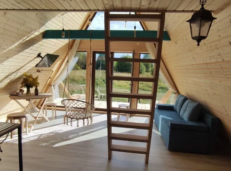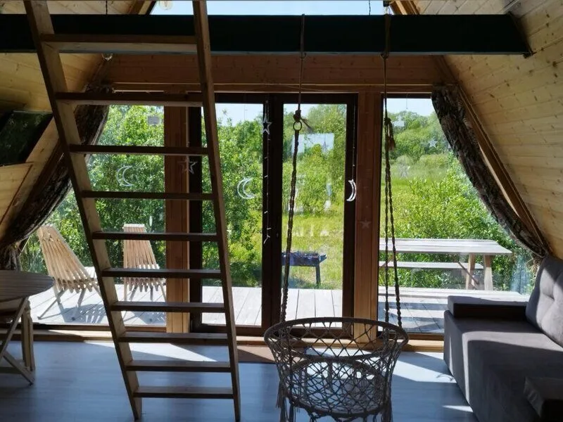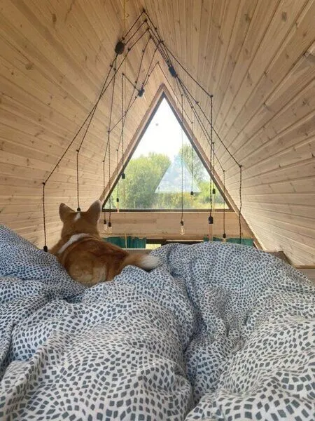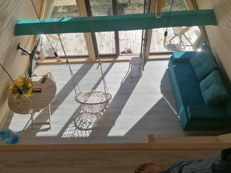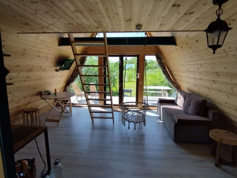Гостям предлагается расположиться в уютных треугольных домиках или в бревенчатом коттедже для большой компании. Все дома оснащены собственной ванной комнатой, телевизором, Wi-Fi и комфортными спальными местами.