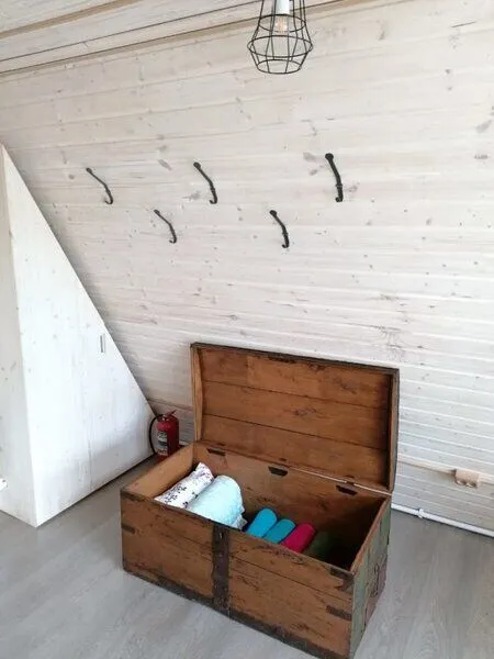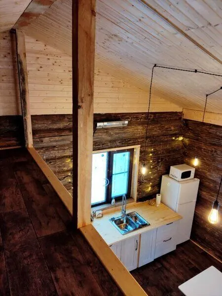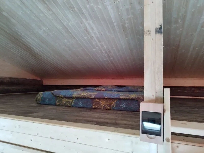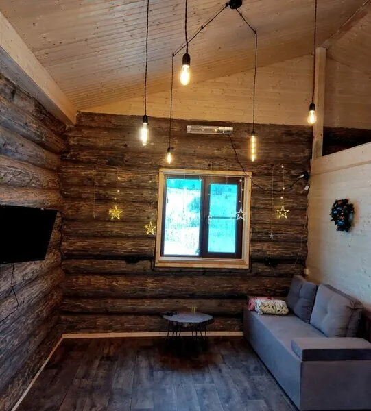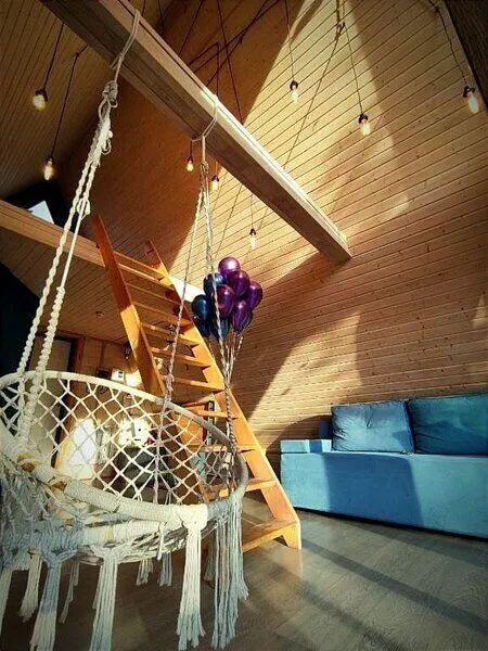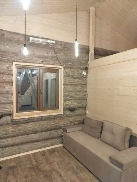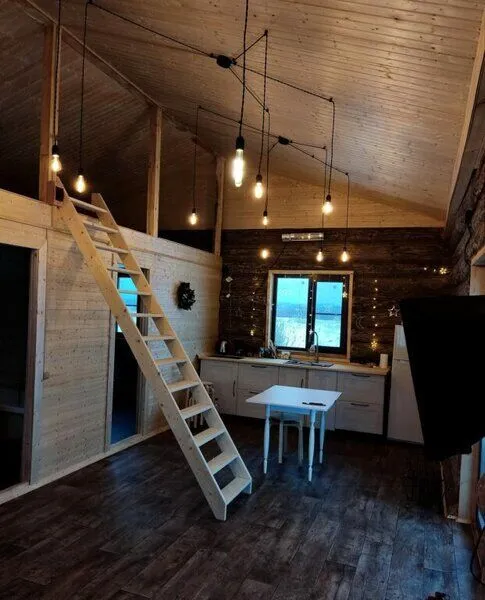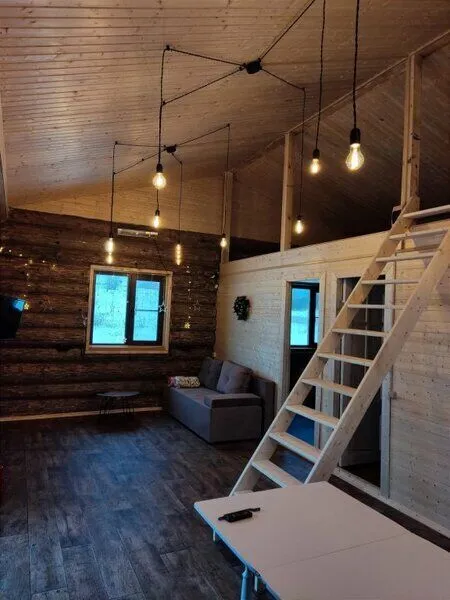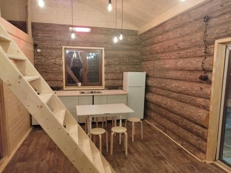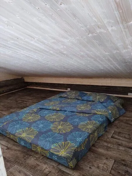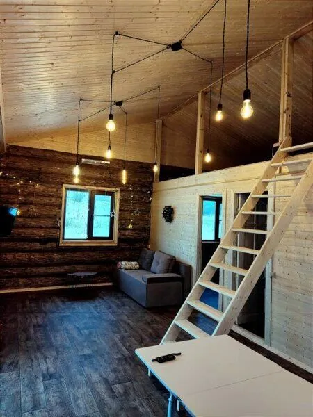 В доме зал совмещен с кухней, 2 спальни на 1 этаже, туалет, лестница на 2 этаж открытой планировки, где расположена еще одна кровать на 2 человека.