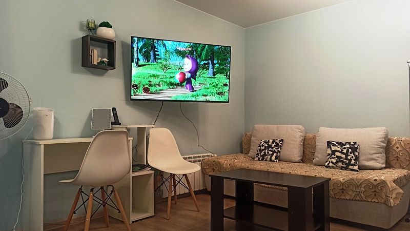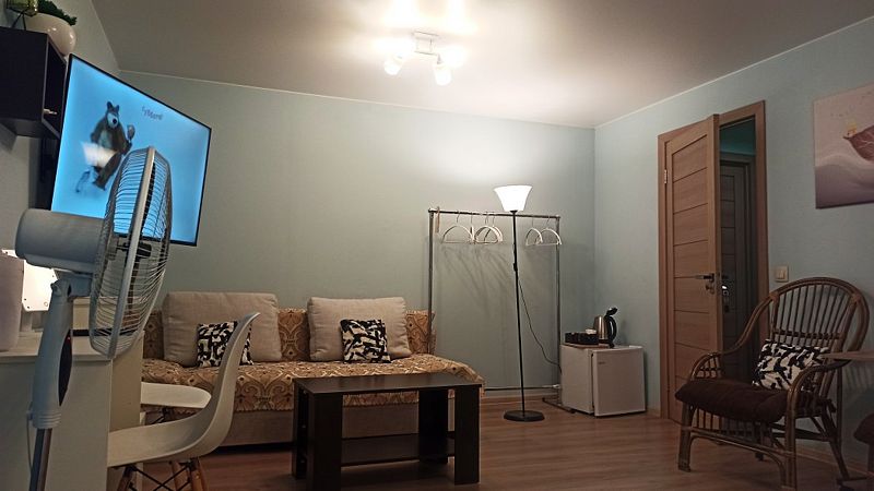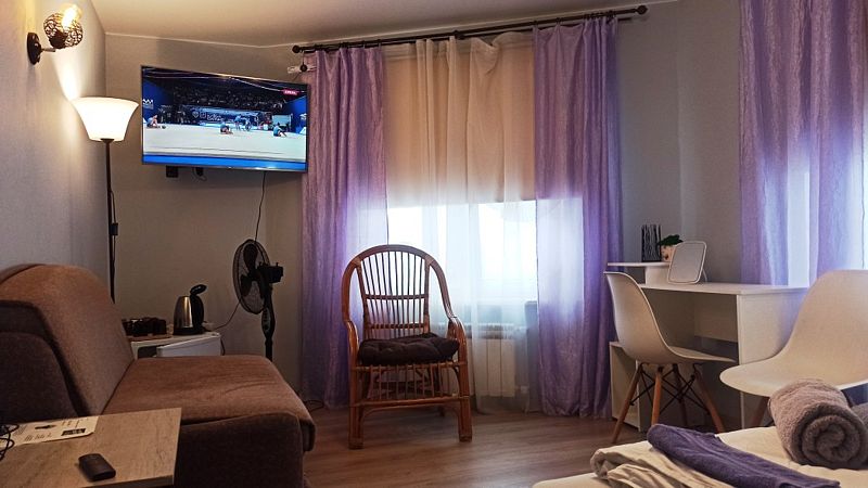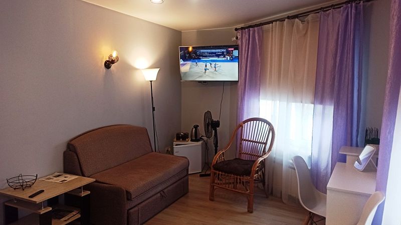 Оснащение номера: кондиционер, вентилятор, телевизор (45-50 дюймов, IP каналы), журнальный и кофейный столики, кресло, стулья, вешалка для одежды, тумбочки, минихолодильник, чайник и чайный набор, солнцезащитные шторы, разноуровневое освещение.