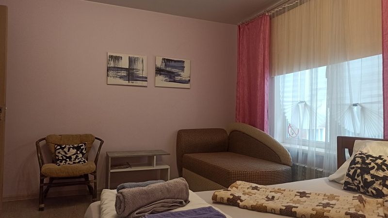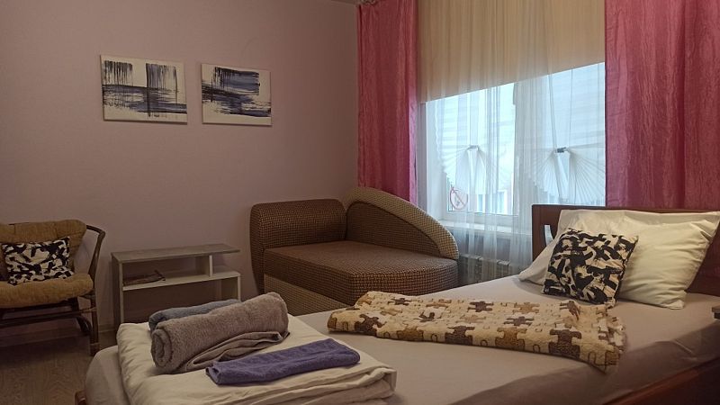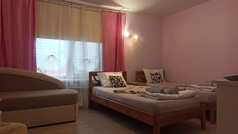 Комната с двумя односпальными кроватями и диваном, максимально возможное размещение — 3 человека, дополнительные места не предоставляются.