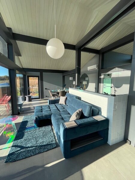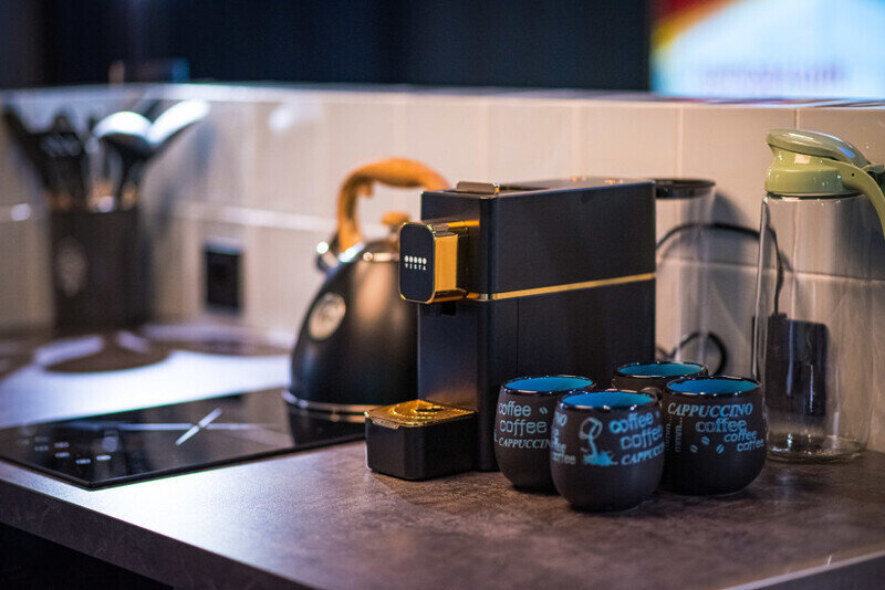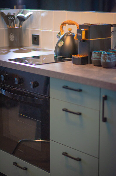 - Просторная гостиная с полностью оборудованной кухней (духовой шкаф, плита, посудомоечная машина, кофемашина, чайник) с кухонным столом и большим раскладывающимся диваном.