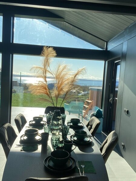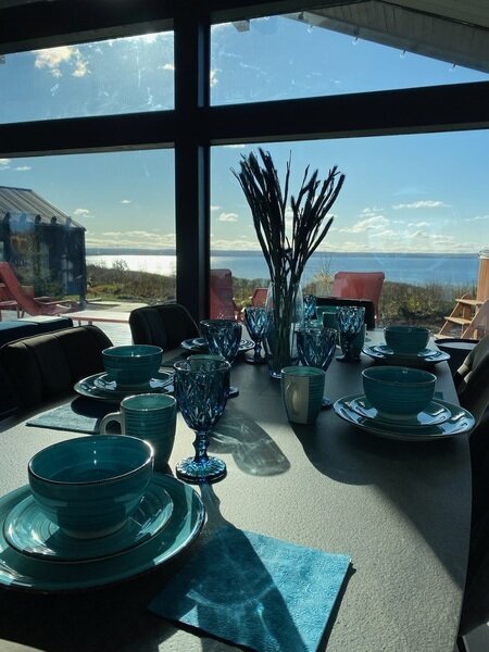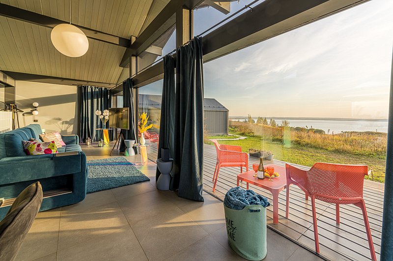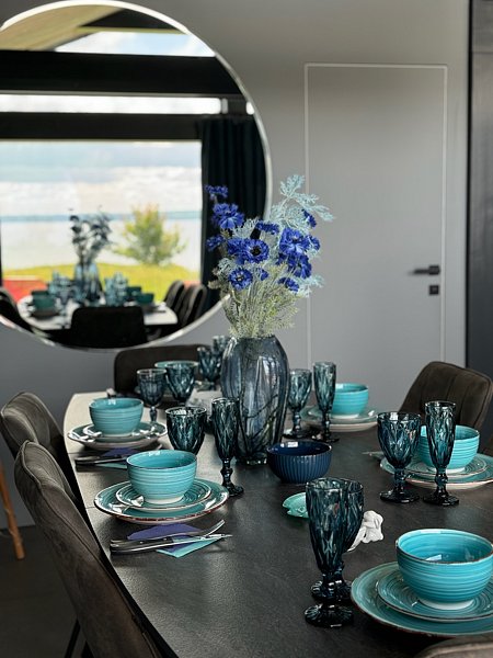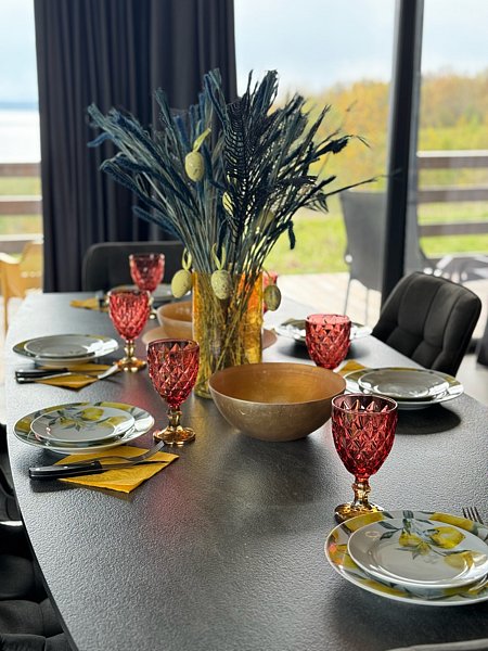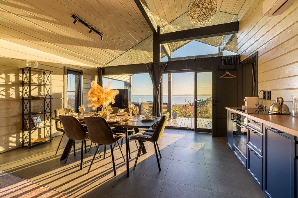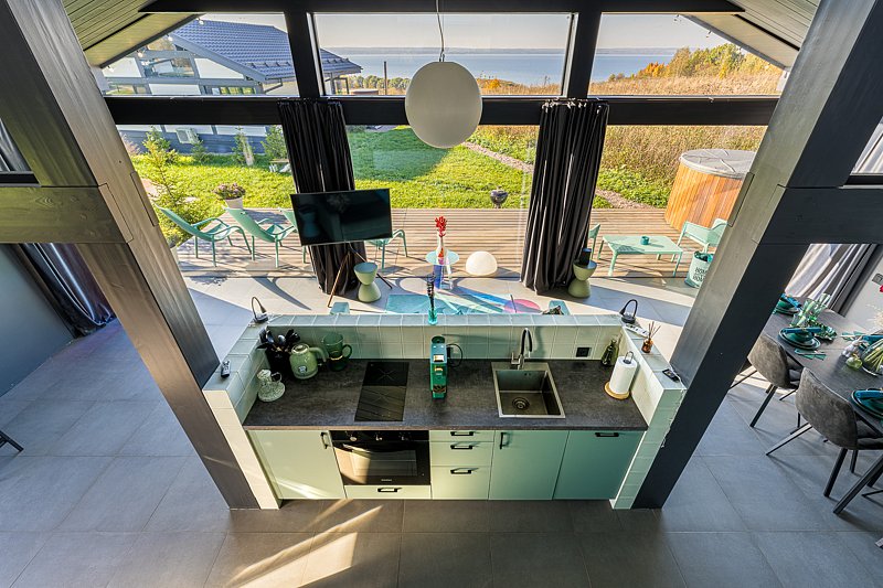 - Просторная кухня-гостиная с панорамным остеклением и видом на озеро;