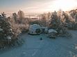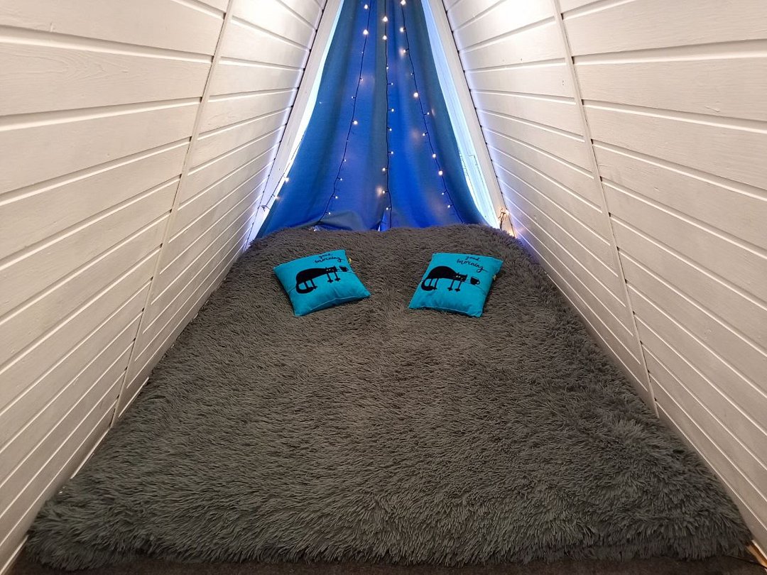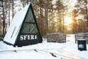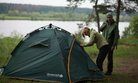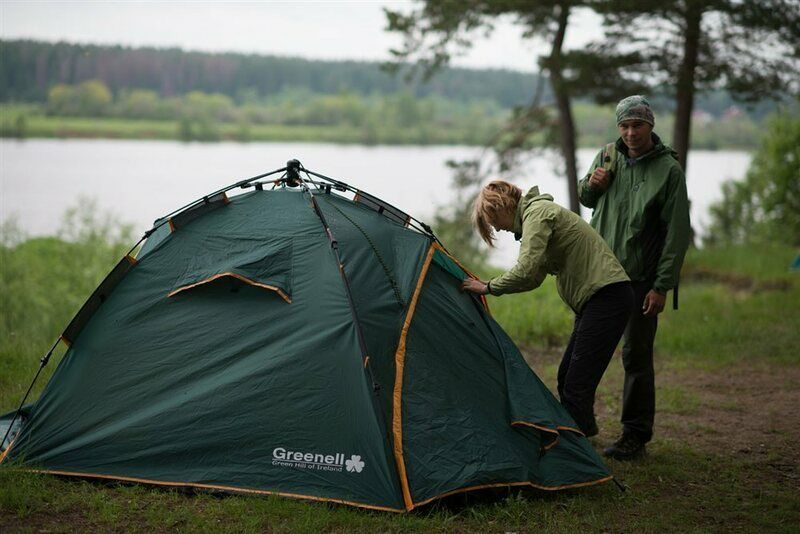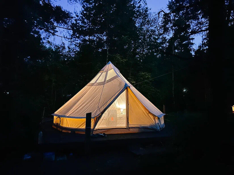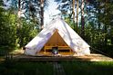 2 комнаты для сна и один общий тамбур. В каждой палатке предоставляются спальные мешки и мягкие теплые коврики. Палатки установлены на подготовленных полянах со скошенной травой, где установлен кемпинговый деревянный стол с лавочками, мангал, дрова. Поляны обработаны от клещей и змей. Полянки расположены в сосновом лесу, до озера около 300 метров, до парковки около 100 метров. Гости могут бесплатно пользоваться инфраструктурой кемпинга: парковка, волейбол, батут, баскетбольное кольцо, пирс, дрова, туалеты.