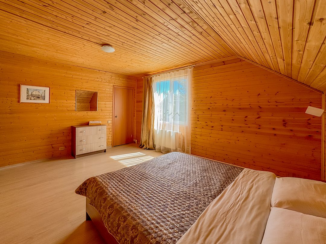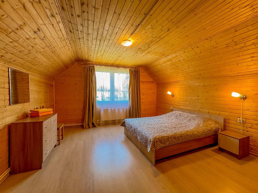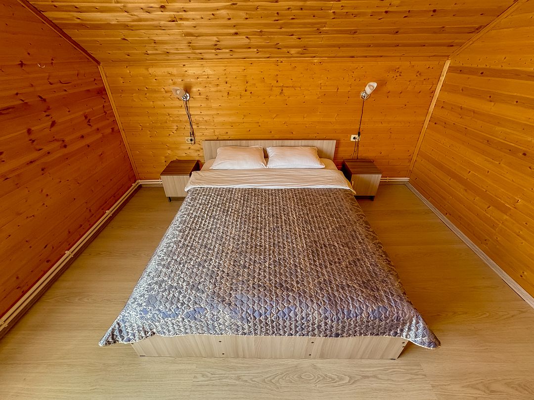 5 двухэтажных домов на 10 человек. Площадь дома 130 кв.м. Интерьер домов выполнен в экостиле: просторные, светлые помещения, декорированные натуральными материалами. У каждого дома есть крытая веранда и мангал.