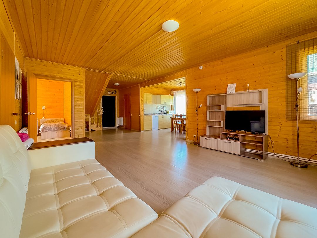 Одноэтажная просторная и светлая резиденция с 2 отдельными спальнями и большой гостиной-кухней. Каждый дом оснащен сауной, личной верандой, а на улице находится оборудованная мангальная зона.