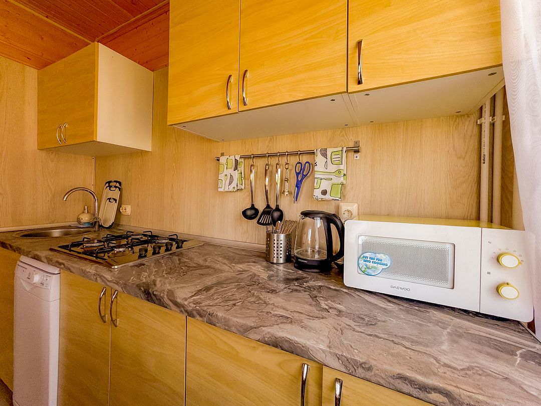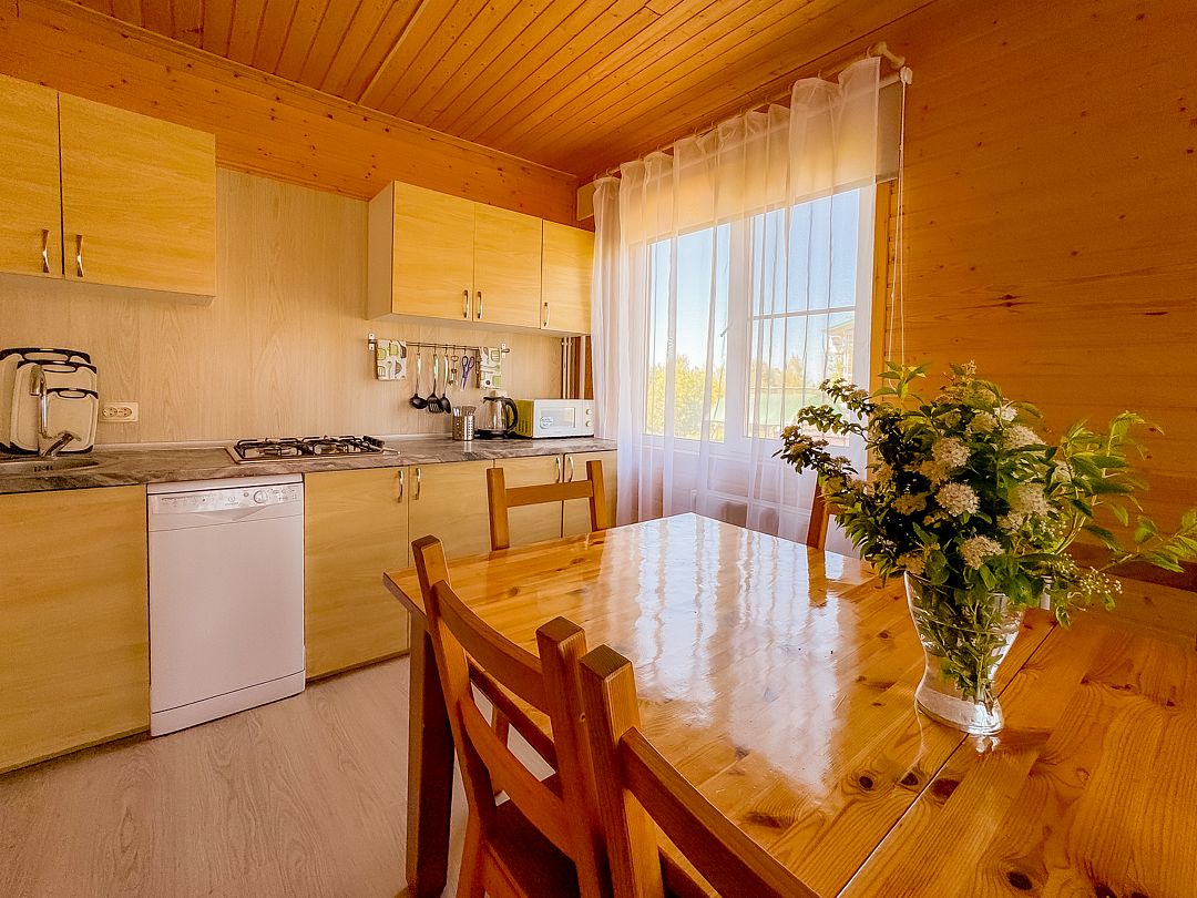 Просторная кухня оснащена необходимой техникой, в том числе газовой плитой и посудомоечной машиной. Также имеется вместительный обеденный стол и посуда. У гостей есть возможность приготовить любимые блюда на мангале.