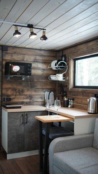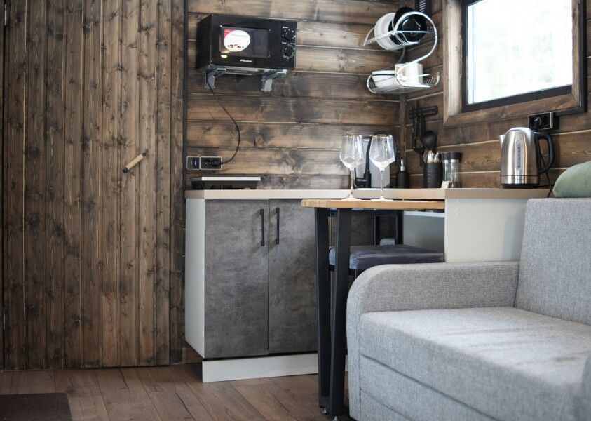 В домике своя небольшая кухня со столом, стульями, инфракрасной плитой, раковиной, мини-холодильником, микроволновкой и всем, что нужно: чайник, сковорода, кастрюля, доска, приборы и посуда.