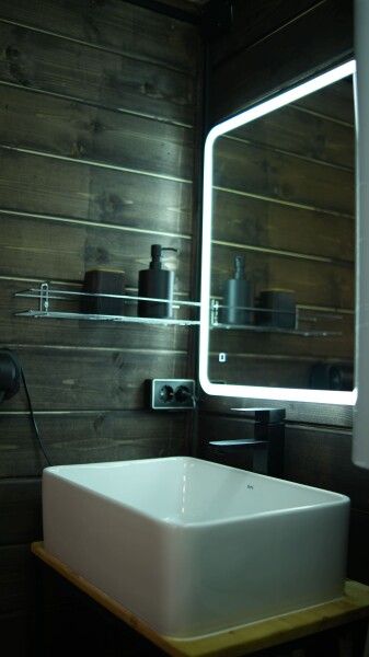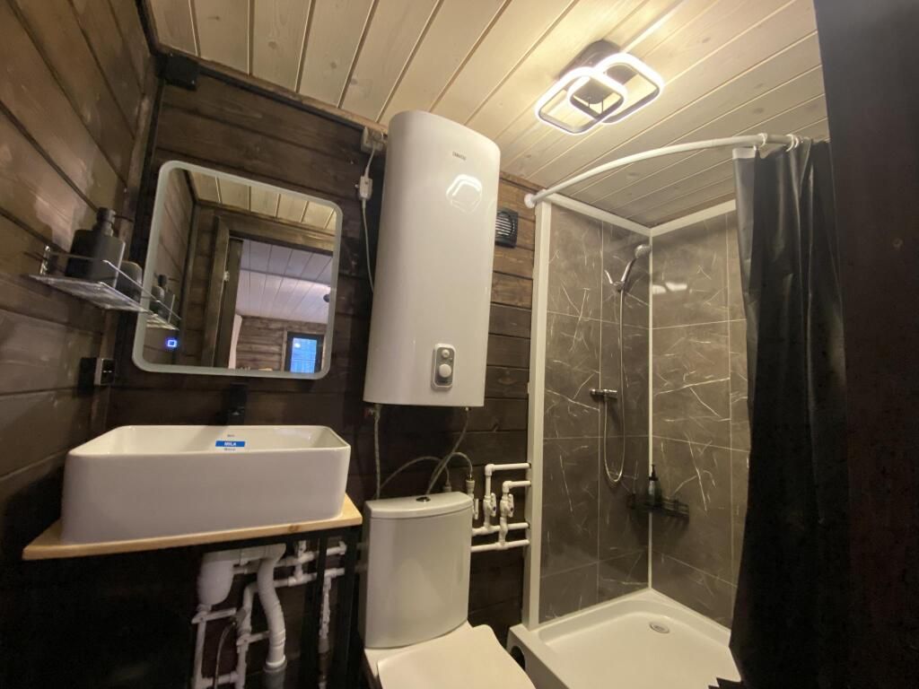 В домике есть своя веранда и ванная комната, в ней — душ, туалет и раковина с зеркалом.
