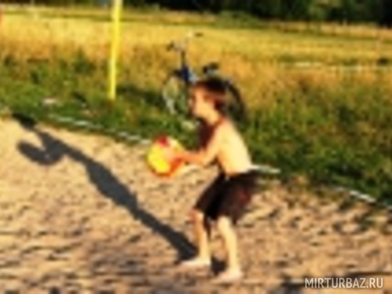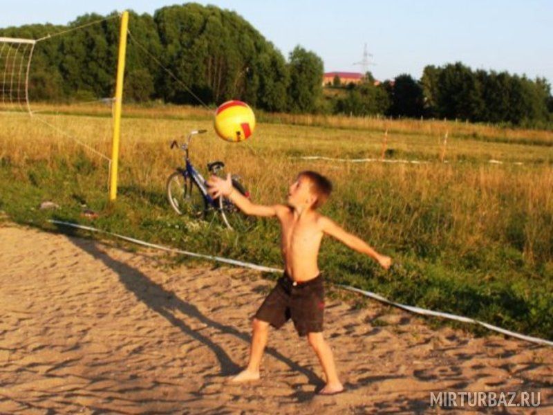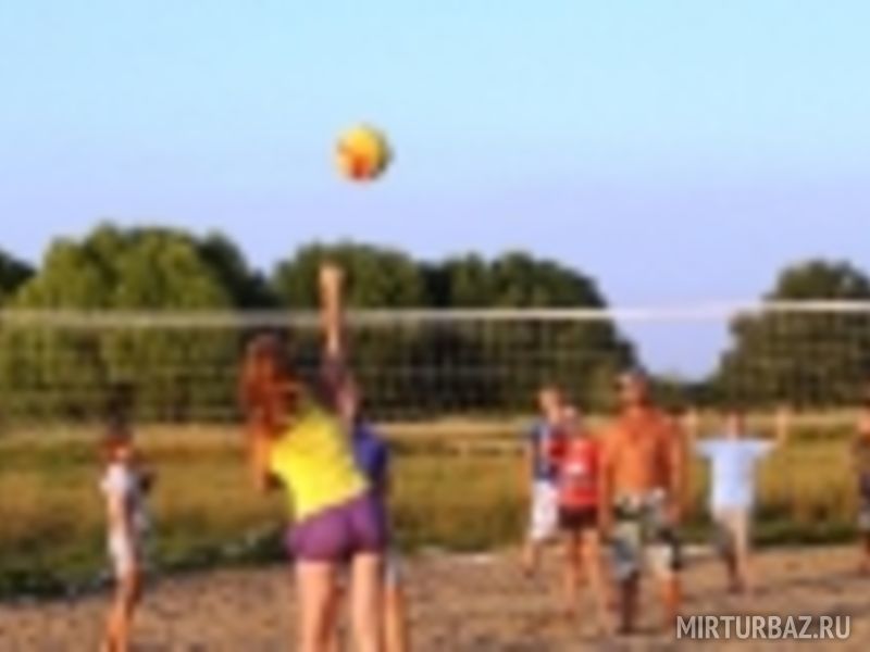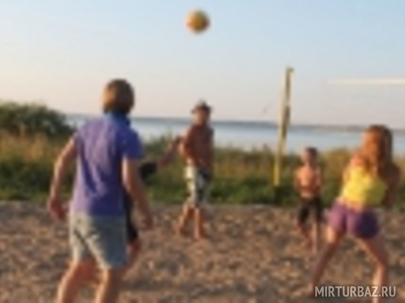 Есть банька. Фубольное и волейбольные площадки. Кайт-зона и серф-пляж. Детская площадка.