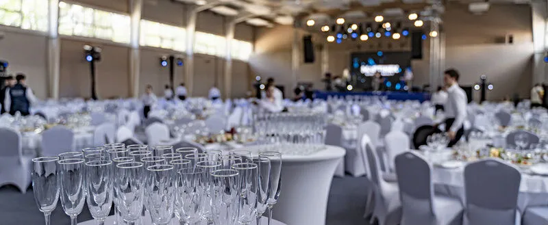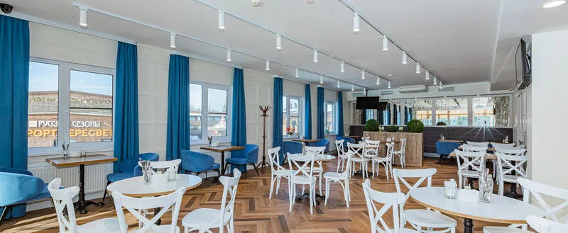 Современный банкетный зал с панорамными окнами и возможностью проведения банкетов до 500 человек. В зале предусмотрена сцена с профессиональным оборудованием, а также welcome—зона с барной стойкой для приветственного фуршета и танцев.
