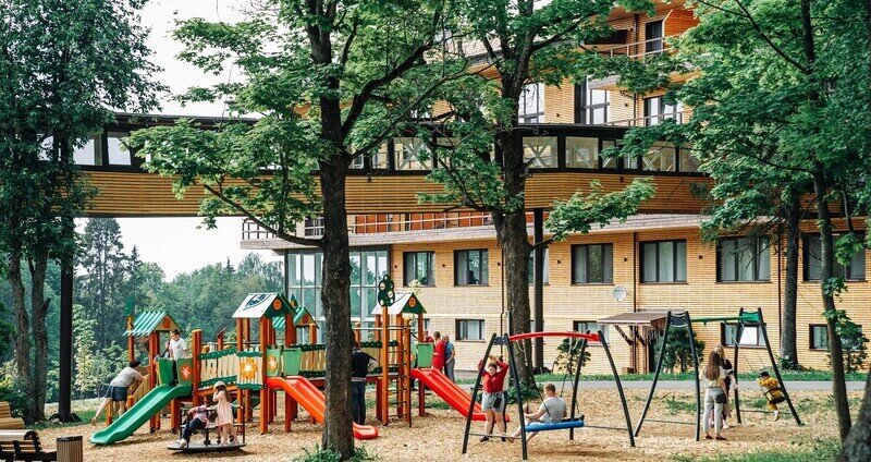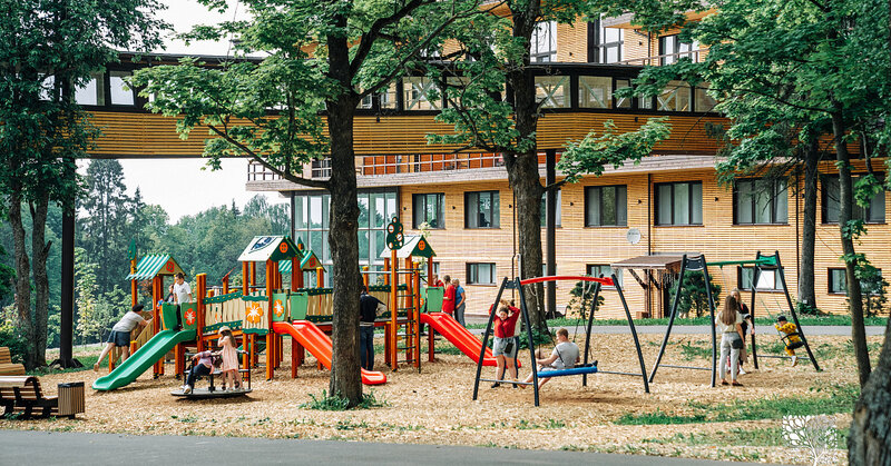 На территории имеются 3 детских игровых площадки, две из них с монолитным резиновым покрытием. На площадках есть горки, подвесные качели-гамаки, карусели и свободная зона для игр. Все площадки в свободном доступе и обязательно порадуют маленьких гостей.
