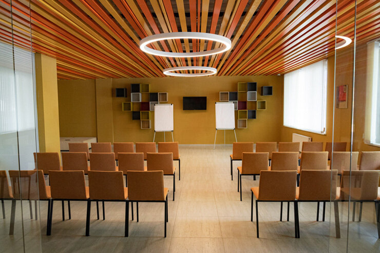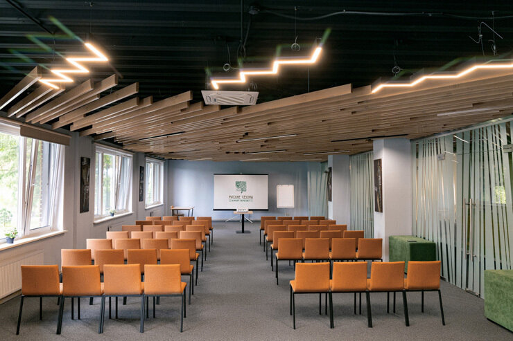 Конференц-пространство вмещает в себя до 70 человек и идеально подходит для проведения деловых встреч, выставки, тренингов.