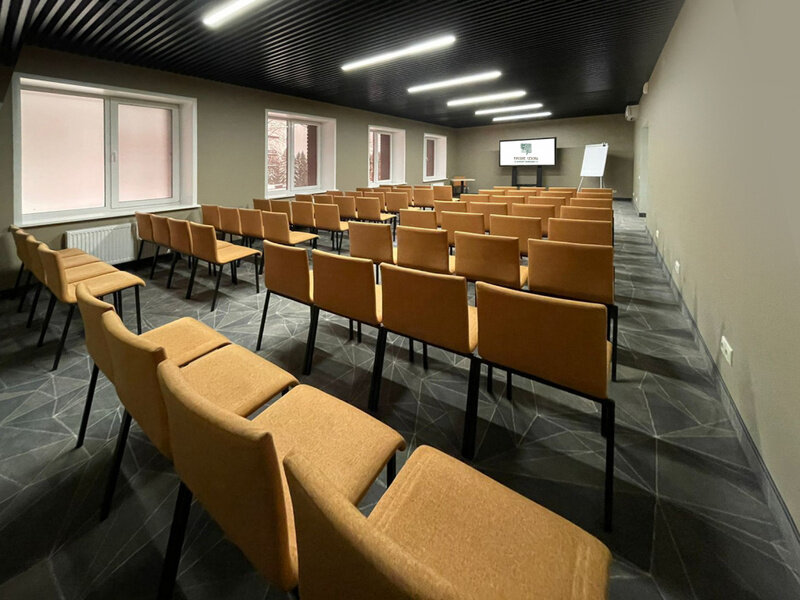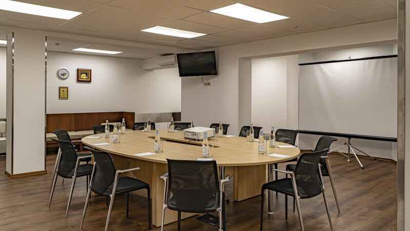 Зал с дневным освещением оснащён всем необходимым оборудованием для небольших конференций и переговоров на 100 человек.