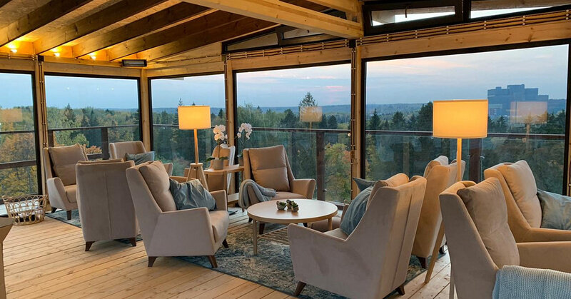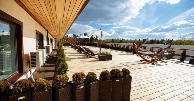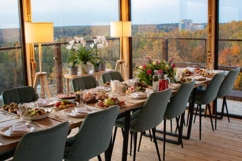 Многофункциональная банкетная площадка располагается на 5 этаже, с которого открываются захватывающие панорамы на лесной массив и яркие закаты на берегу озера, а также музыкальные салюты, которые мы организуем для Вас по предварительному запросу