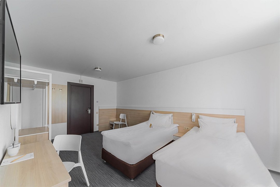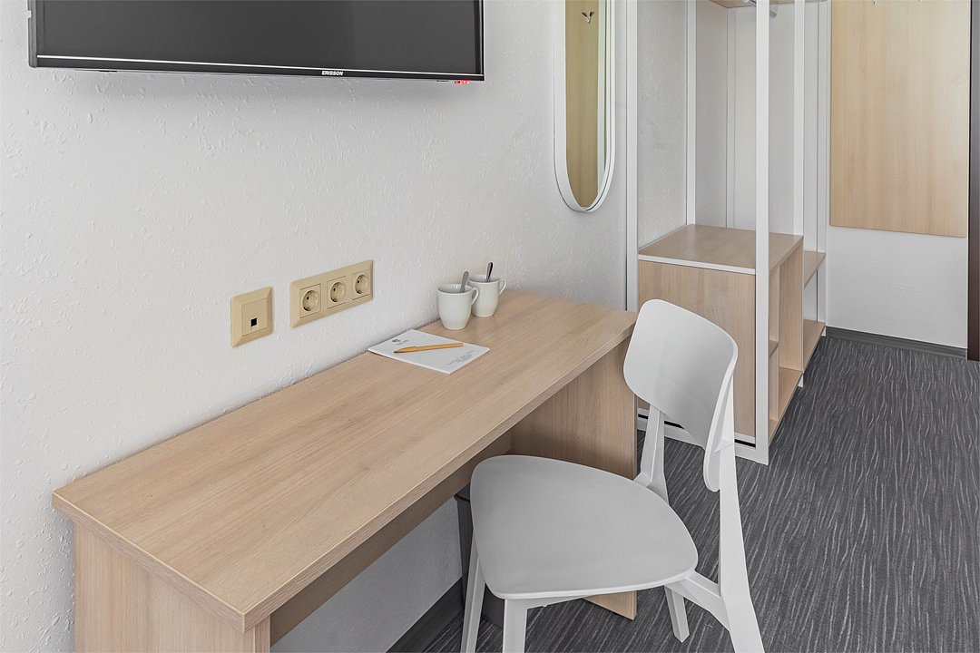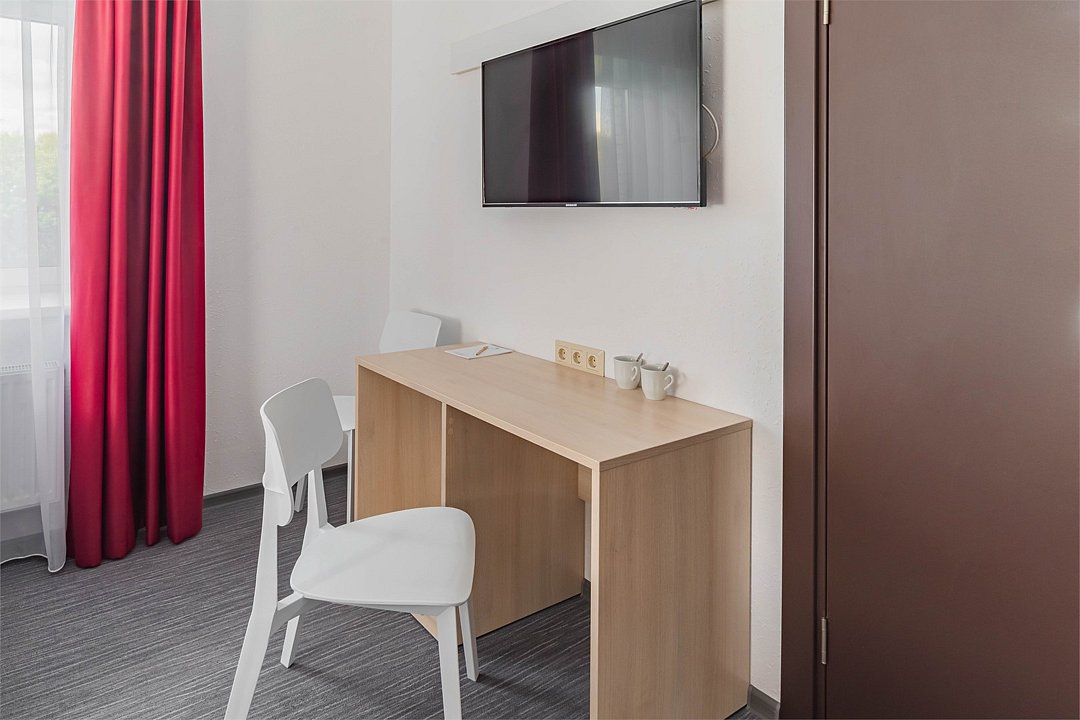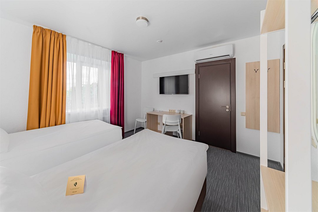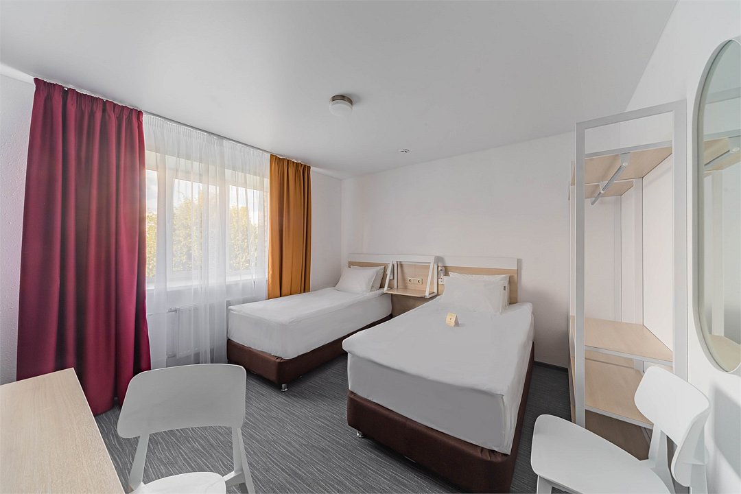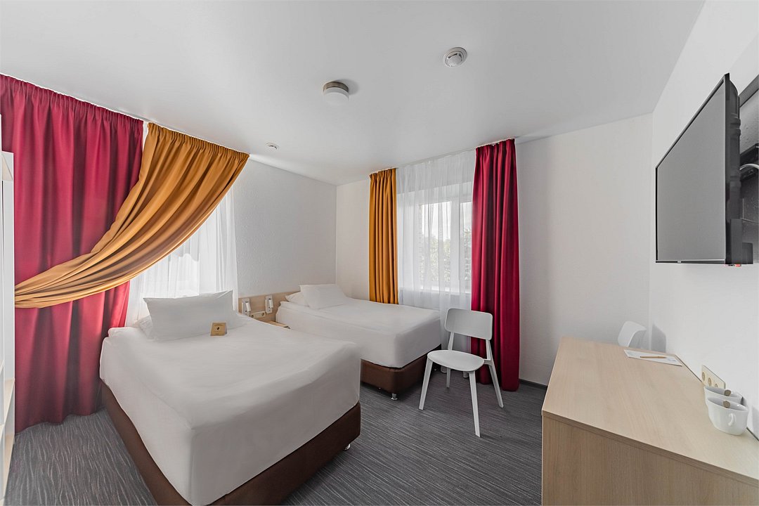 Wi-Fi, кондиционер, электронные замки, ванна или душевая кабина, две односпальные кровати, тумбы, унитаз, раковина, отопление, вид на город, кулер на этаже, вид во двор, стаканы, стул, туалет, телевизор с плоским экраном, номер для некурящих, usb портВ номере