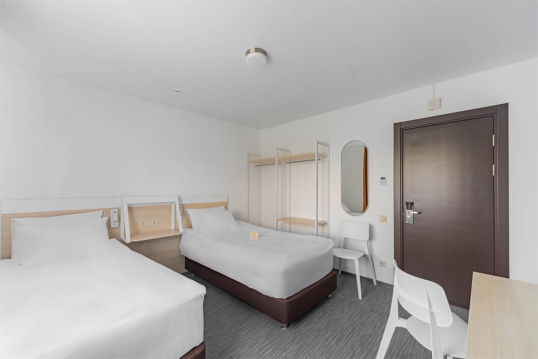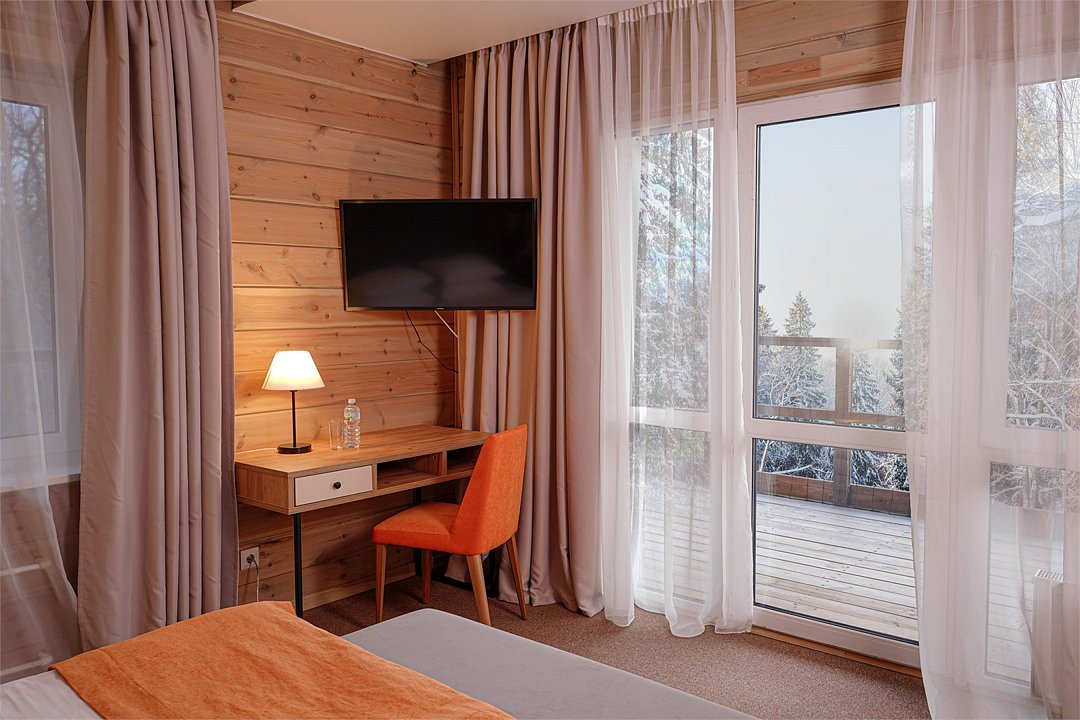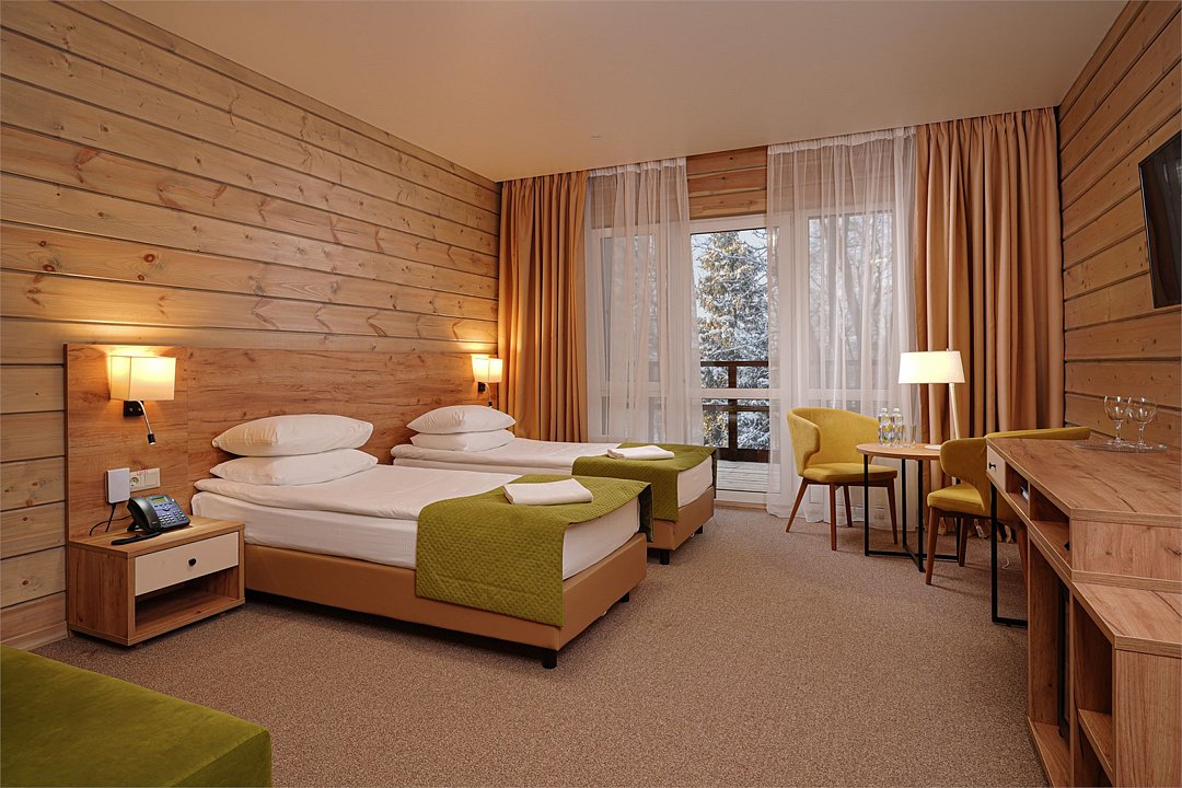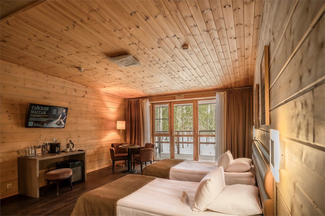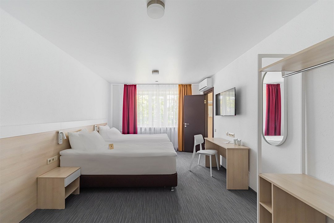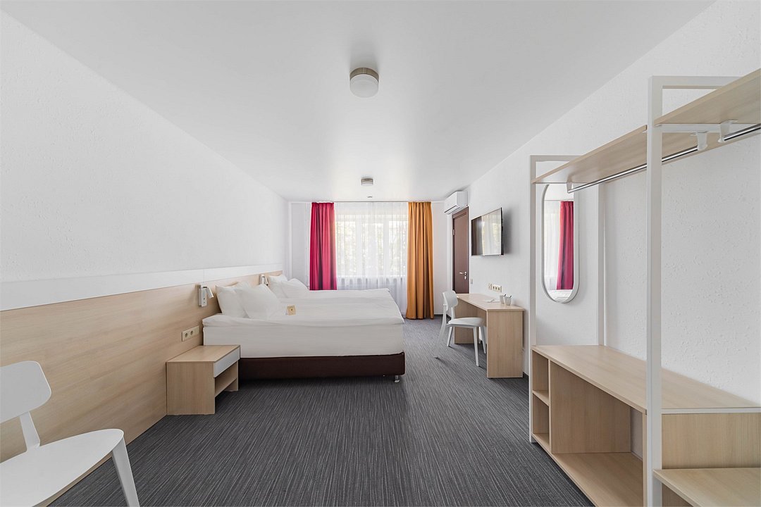 Комфортабельный двухместный номер со всеми удобствами, оборудован двумя раздельными кроватями (кровати не сдвигаются) и дополнительным местом. Обращаем Ваше внимание,что в зависимости от загрузки заселение возможно на основной территории Курорта.Услуги и удобства