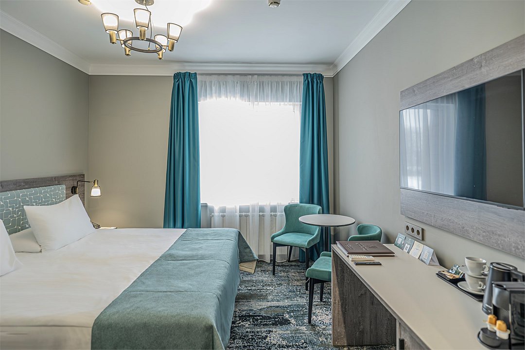 Стандартный двухместный номер с одной либо двумя раздельными кроватями, стиль исполнения - классический. Обращаем Ваше внимание,что в зависимости от загрузки заселение возможно на основной территории Курорта.Услуги и удобства