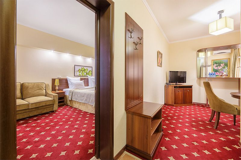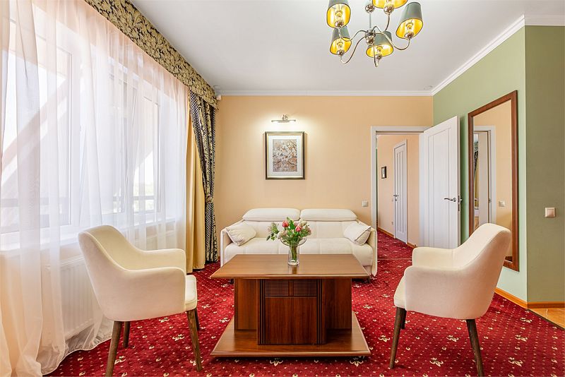 Двухкомнатный номер с большим балконом и всем необходимым для комфортного проживания, предназначен для комфортного размещения двух человек на основных местах и еще двоих — на дополнительном месте. Уютный интерьер в классическом стиле позволит чувствовать себя здесь как дома.