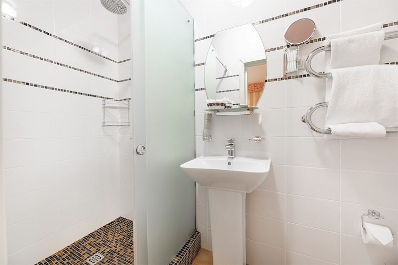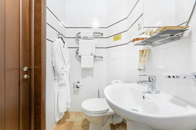 В ванной комнате: душевая кабина, фен, косметическое зеркало, комплект полотенец (4 на персону), халат, тапочки, набор гостиничной косметики.